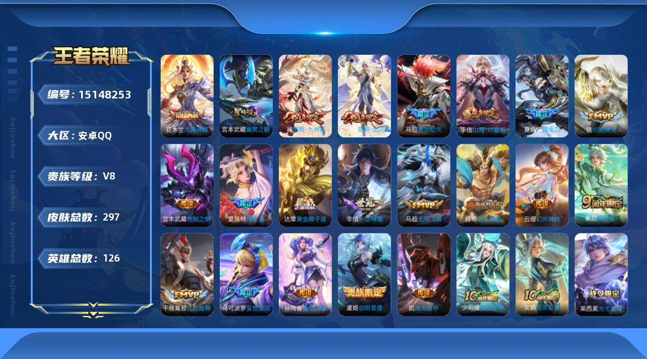 [15148253]【店主推荐捡漏号!可直接换绑】安卓Q-V8-最强王者段位-126英雄-297皮肤-1典藏皮肤-21传说-92史诗