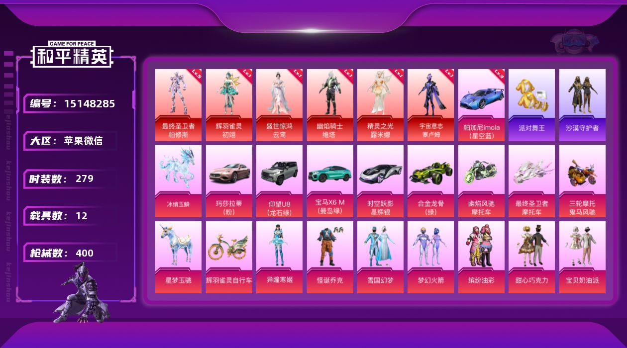 [15148285]可二次【店主推荐捡漏号!可直接换绑】/素材身法号/最终圣卫者-帕修斯(五级)/无敌战神框1/绝世印记9/地铁满天赋 苹果 微信-无敌战神框-6神装-40粉装-27特效枪-12载具-24粉色飞行器-17w热力值-18王牌印记-279套装-400枪皮【红色载具】:帕加尼imola(星空蓝)(三级)【红色神装等级】:最终圣卫者-帕修斯(五级),辉羽雀灵-初翊(一级),盛世惊鸿-云鸾(一级),幽焰骑士-维塔(一级),精灵之光-露米娜(一级),宇宙意志-塞卢姆(一级)【热门品类】:粉装-怪诞乔克,粉装-雪国幻梦,粉装-梦幻火箭,粉装-缤纷油彩,套装-浪漫天命,套装-派对舞王,角色-军刀雅典娜,套装-沙漠守护者,套装-龟仙人,套装-暗影哥特,套装-软软马卡龙【粉色套装】:粉装-怪诞乔克,粉装-甜心巧克力,粉装-宝贝奶油派,粉装-天使彩虹糖,粉装-雪国幻梦,粉装-蝶舞迷情,粉装-梦幻火箭,粉装-星之信仰,粉装-缤纷油彩,粉装-放客神游,粉装-迷蝶贵族,粉装-冰霜白皇,粉装-炙焰红王,粉装-飓风飞鹰,粉装-山涧鹿灵,角色-初号机款机体服,粉装-碧影闪光,角色-复仇流浪者,粉装-暖熊萌萌,粉装-绒雪飘舞,粉装-傲雪凌霜,粉装-霁雪冰心,粉装-冰川粉黛,粉装-萌物绒绒,角色-星梦奇缘,角色-冰域雷影,角色-狂花道·不知火舞,角色-千金淑猫,角色-信仰神谕,粉装-幻梦之森,角色-女娲灵识,粉装-幻彩电音,角色-冷漠罗丽,角色-荧海星豚,角色-奇迹舞步 贝贝,角色-奇迹舞步 雅雅,角色-奇迹舞步 美琪,角色-奇迹舞步 美雪,角色-异瞳寒姬【粉色枪皮等级】:AKM-甜心宝贝(二级),AKM-幽焰骑士(三级),M16A4-垂柳戏鸭(一级),SCAR-L-纯梦嫁纱(五级),SCAR-L-锦绣绵绵(五级),M416-五爪金龙(六级),M416-灵猫魔法师(六级),GROZA-精灵之光(三级),AUG-星梦奇缘(三级),蜜獾-荧海星豚(一级),UMP45-宇宙意志(三级),Vector-环太平洋(三级),Vector-最终圣卫者(六级),汤姆逊-热量炸弹(五级),AKS-74U-信仰神谕(五级),P90-魔童闹海 敖丙(三级),Kar98K-未来歌姬(五级),Kar98K-巳巳如意(五级),Mk14-盛世惊鸿(一级),M200-伏羲圣卦(一级),M249-绒雪飘舞(三级),M249-彩虹甜喵(七级