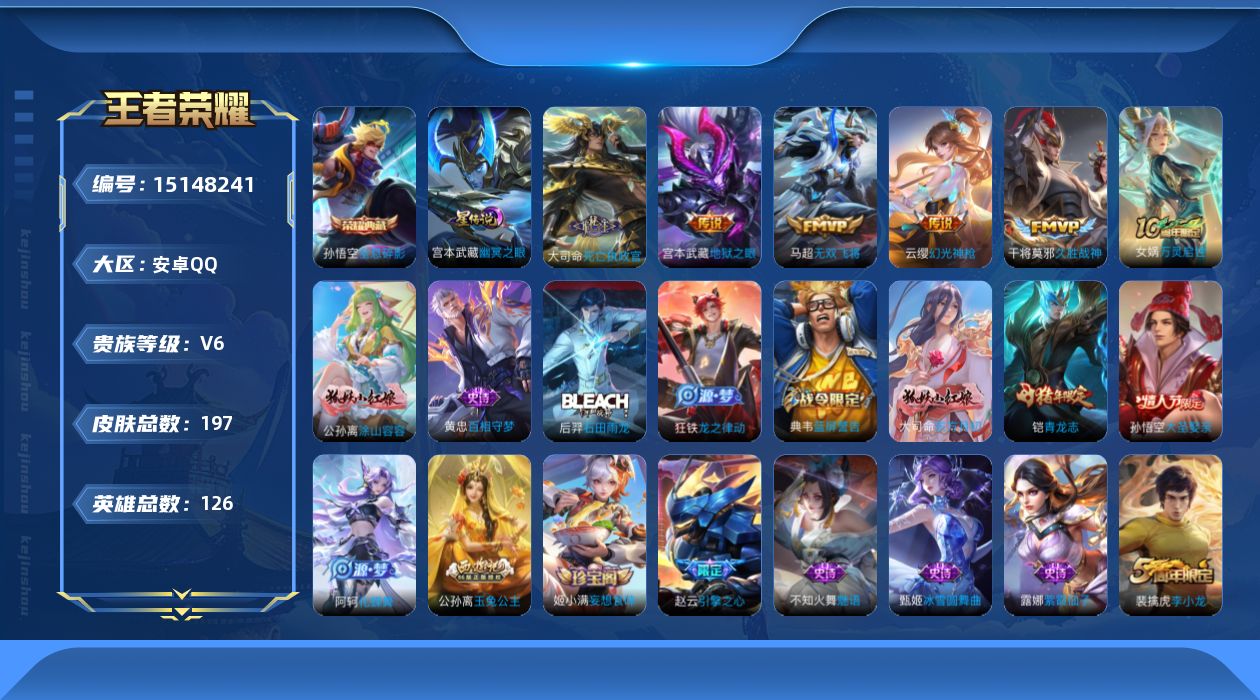 - [13107727]安卓Q-V0-最强王者段位-125英雄-255皮肤-0典藏-0珍品无双-0无双-0珍品传说-17传说-68史诗 【英雄全皮】:蒙恬全皮 【传说皮肤】:后羿神树通天,桑启鸣野蒿,典韦战鼓燎原,赵云乘龙铭钟鼎,马超琥珀纪元,澜逐花归海,宫本武藏惊梅引,曜山海苍雷引,李白诗剑行,马超无双飞将,镜炽阳神光,曜云鹰飞将,李信一念神魔,刘备时之恋人,达摩黄金狮子座,宫本武藏地狱之眼,狄仁杰超时空战士 【限定皮肤】:白起狰,姜子牙天穹之誓,狄仁杰阴阳师,虞姬凯尔特女王,赵云皇家上将,赵云引擎之心,嬴政优雅恋人,孙尚香蔷薇恋人,庄周高山流水,高渐离玩趣恶龙,钟无艳超时空战士,扁鹊炼金王,芈月重明,元歌无心,夏侯惇朔风刀,甄姬游园惊梦,甄姬落雪兰心,曹操烛龙,典韦穷奇,马可波罗暗影游猎,狄仁杰魔术师,狄仁杰万华元夜,达摩沙漠行僧,项羽海滩派对,老夫子醍醐杖,程咬金演武夺筹,韩信飞衡,兰陵王金庭之子,孙悟空至尊宝,牛魔御旌,刘备百相守梦,李元芳云中旅人,钟馗驱傩正仪,杨玉环遇见飞天,干将莫邪真爱魔法,雅典娜黎明之约,蔡文姬繁星吟游,太乙真人饕餮,鬼谷子原初探秘者,鬼谷子五谷丰年,苏烈千军破阵,百里玄策原初追逐者,弈星混沌棋,梦奇顽趣,沈梦溪大漠名商,明世隐疑决卦,裴擒虎李小龙,裴擒虎擒涛扼浪,狂铁御狮,米莱狄御霄,云中君纤云弄巧,盾山御銮,猪八戒西部大镖客,上官婉儿梁祝,曜山海苍雷引,鲁班大师探海日志,镜匿光追影者,桑启海盐诗旅,艾琳流音漫舞,赵怀真鹤归松栖,司空震地狱燃心,阿古朵江河有灵,张良古海寻踪,蒙恬荣光圣徽,鬼谷子天穹祈灯,马超琥珀纪元,赵云乘龙铭钟鼎,沈梦溪龙舞盛年,刘邦剑破天穹,镜青焰无极,项羽苍威无极,周瑜熔金海岸 【年限皮肤】:韩信飞衡,马超神威,曜山海苍雷引,赵云乘龙铭钟鼎 【赛季限定】:扁鹊炼金王,白起狰,芈月重明,夏侯惇朔风刀,曹操烛龙,典韦穷奇,狄仁杰万华元夜,达摩沙漠行僧,老夫子醍醐杖,程咬金演武夺筹,兰陵王金庭之子,张良古海寻踪,牛魔御旌,李元芳云中旅人,虞姬凯尔特女王,钟馗驱傩正仪,雅典娜黎明之约,太乙真人饕餮,鬼谷子原初探秘者,苏烈千军破阵,百里玄策原初追逐者,弈星混沌棋,梦奇顽趣,沈梦溪大漠名商,明世隐疑决卦,裴擒虎擒涛扼浪,狂铁御狮,米莱狄御霄,盾山御銮,鲁班大师探海日志,桑启海盐诗旅,鬼谷子天穹祈灯,蒙恬荣光圣徽,刘邦剑破天穹,姜子牙天穹之誓