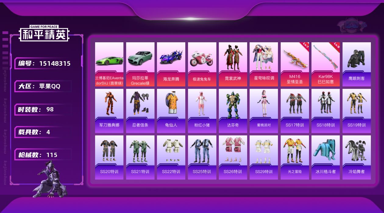 [15148315]【店主推荐捡漏号!可直接换绑】地铁满天赋 素材身法号苹果 手Q-2粉装-2特效枪-4载具-1粉色飞行器-38014热力值-8王牌印记-98套装-115枪皮 【热门品类】:角色-军刀雅典娜,套装-忍者信条,套装-龟仙人,套装-粉红小猪 【粉色套装】:粉装-霓裳武神,粉装-星穹咏叹调 【粉色枪皮等级】:M416-至情至圣(七级),Kar98K-巳巳如意(五级) 【粉色载具】:兰博基尼Aventador SVJ(翡翠绿),玛莎拉蒂Grecale(薄荷绿),海龙奔腾,极速兔兔车 【粉色枪皮】:M416-至情至圣,Kar98K-巳巳如意 【粉色降落伞】:蓝莓炮弹降落伞,环太平洋降落伞,垂柳戏鸭降落伞,翩跹演武降落伞 【稀有套装】:套装-龟仙人,角色-达芬奇,角色-蜜桃派对,套装-炫彩糖果 【稀有枪皮】:AKM-夜灯,AKM-彩虹符号,AKM-灼热熔岩,AKM-王牌投手,AKM-破晓战魂,AKM-虎虎生威,AKM-霓虹街区,AKM-龙的传人,M16A4-幻世战舞者,M16A4-甜心亚梦,M16A4-蓝色火焰,SCAR-L-玉兔迎春,SCAR-L-红色方程式,M416-圣诞惊喜,M416-糯团青竹,M416-红色方程式,M416-蓝色火焰,GROZA-异彩先驱,GROZA-影袭,GROZA-田园牧歌,AUG-天降萌叽,AUG-耀粉歌者,AUG-绝对恒星,M762-天降萌叽,M762-彩虹符号,AC-VAL-天降萌叽,AC-VAL-甜心亚梦,蜜獾-天降萌叽,蜜獾-娇憨猪猪,UZI-天降萌叽,UZI-娇憨猪猪,UZI-影袭,UMP45-夜灯,UMP45-生命誓言,UMP45-蓝色火焰,Vector-生命誓言,Vector-田园牧歌,汤姆逊-天降萌叽,汤姆逊-异彩先驱,汤姆逊-环太平洋,MP5K-异彩先驱,P90-筑梦精灵,P90-巳巳如意,Kar98K-彩虹符号,Kar98K-影袭,Kar98K-炫彩节奏,M24-炫彩节奏,AWM-垂柳戏鸭,VSS-田园牧歌,Mini14-异彩先驱,Mini14-海渊国主,Mini14-筑梦精灵,SLR-娇憨猪猪,SVD-冷漠罗丽,S686-未来战士,S686-王牌投手,S1897-炫彩节奏,S12K-破晓战魂,S12K-垂柳戏鸭,S12K-娇憨猪猪,S12K-幻世战舞者,DBS-甜心亚梦,SPAS-12-田园牧歌,M249-彩虹符号,M249-百