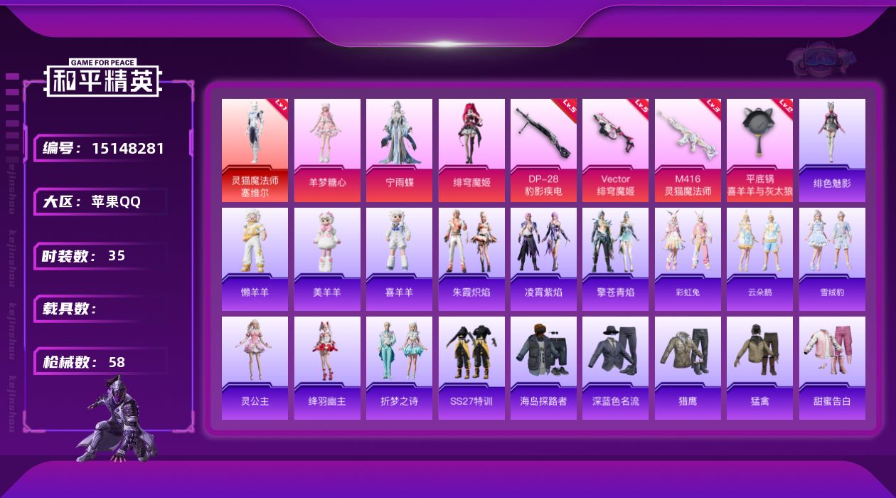 [15148281]【店主推荐捡漏号!可直接换绑】苹果 手Q-1神装-3粉装-4特效枪-0载具-2粉色飞行器-2w 热力值-2王牌印记-35套装-58枪皮【红色神装等级】:灵猫魔法师-塞维尔(一级)【红色角色神装】:灵猫魔法师-塞维尔【粉色套装】:角色-宁雨蝶,角色-绯穹魔姬,角色-羊梦糖心【粉色枪皮等级】:M416-灵猫魔法师(三级),Vector-绯穹魔姬(五级),DP-28-豹影疾电(五级),平底锅-喜羊羊与灰太狼(二级)【粉色枪皮】:M416-灵猫魔法师,Vector-绯穹魔姬,DP-28-豹影疾电,平底锅-喜羊羊与灰太狼【粉色飞行器】:灵猫魔法师飞行器,飞天猪飞行器