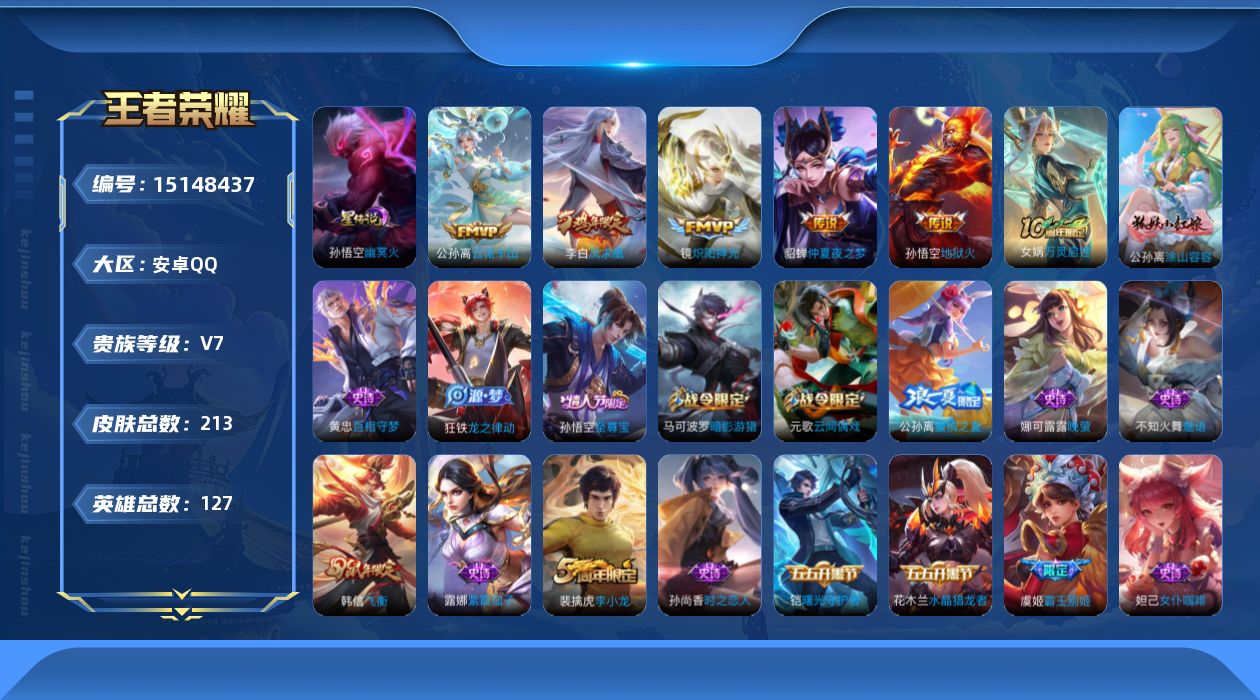 [15148437]可二次,【店主推荐捡漏号!可直接换绑】,安卓Q-V7-最强王者段位-127英雄-213皮肤-6传说-1星传说-46史诗