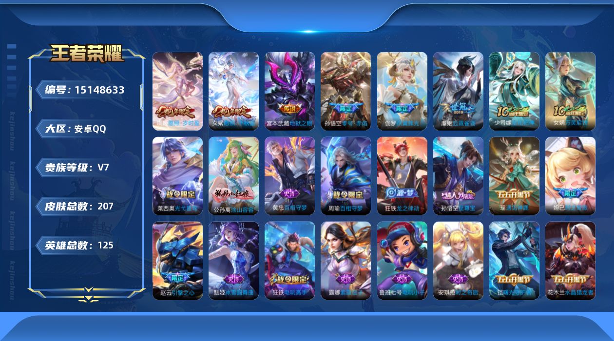- [11526668]V7 1典藏 1无双 13传说 122英雄 147皮肤 可修改实名 优质装备:星域神启(倪克斯贼亮),器灵·螭龙剑,黄金狮子座,云鹰飞将(小将军),久胜战神,一念神魔,零号·赤焰,澜逐花归海 传说皮:祥瑞亨通,幻光神枪 珍宝阁皮:玩趣恶龙 限定皮:愿照·九州拓(澜年限),愿照·岁时盈(虞姬年限),愿照·山河定(司空震年限),逐霄战戟,鸣野蒿,傲雪梅枪,诗剑行,岱宗(典韦年限),天狼溯光者,逐梦之音,引擎之心,百木心枪,玉兔公主,山海·玄木吟(马可年限) 史诗皮:鸭鸭历险记-刘禅,器灵·浮梦炉,糖绘人间,化蝶舞,谪仙醉月,龙之律动,石田雨龙,茶境仙,怒海争锋,破空之剑,决胜骁骑,百相守梦-百里守约,紫霞仙子,电玩小子(小书包),黄金分割率,特工魅影,千年之狐,江河有灵,百解令(蒙犽),偶像歌手,女仆咖啡,水果甜心,天才门将,星夜王子,功夫厨神,暗隐猎兽者,幽灵船长,鬼剑武藏,心灵战警,天秀·启明,地狱岩魂,纤云弄巧,拒霜思,乘风破浪,逐浪之夏,水晶猎龙者,曙光守护者,箭羽风息,金属风暴,圣诞狂欢,鹰眼统帅,魅力维加斯,黎明之约,未来纪元-赵云