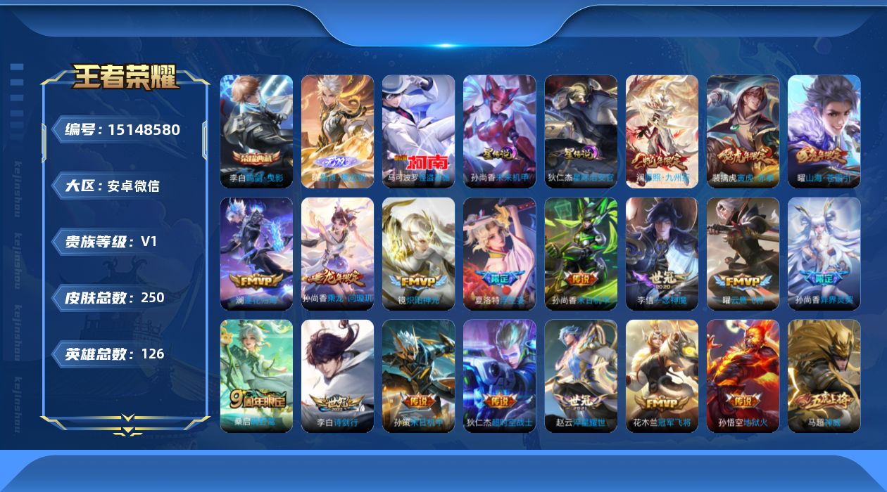 [15148580]安卓WX-V0-最强王者段位-126英雄-250皮肤-1典藏皮肤-1无双-1珍品传说-18传说-79史诗