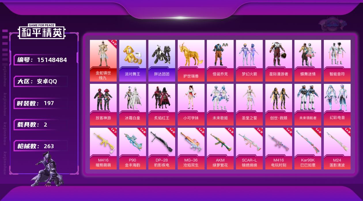 - PX_2103377- 苹果手Q-14王牌印记-3粉装-4特效枪-0载具-57262热力值-147套装-191枪皮-2卓越印记-1传奇印记 【3粉装】,幻影飞狐,闲梦青缨,蔷薇星 【4特效枪】M416-电玩时刻-5级 Kar98K-巳巳如意-5级 Mk14-闲梦青缨-7级 P90-冷漠罗丽-6级 【3稀有紫装】,暗影哥特,小丑鱼,龟仙人, 【147稀有时装】,SS31特训,SS33特训,SS32