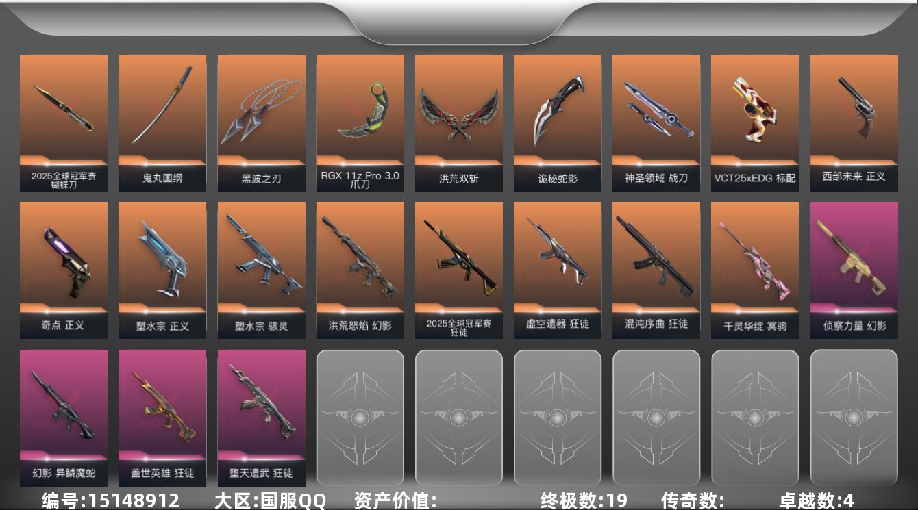 [15148912]【套装】:2025全球冠军赛套装 【英雄】:幻棱,炼狱,维斯,暮蝶,钛狐,壹决,铁臂,捷风,雷兹,幽影,不死鸟,贤者,猎枭,蝰蛇,零,芮娜,奇乐,尚勃勒,霓虹,斯凯,夜露,星礈,K/O,海神,盖可,黑梦,钢锁 【近战武器】:近战武器-2025全球冠军赛 蝴蝶刀,近战武器-RGX 11z Pro//3.0 爪刀,近战武器-黑波之刃,近战武器-鬼丸国纲,近战武器-洪荒双斩,近战武器-诡秘蛇影 军刀,近战武器-神圣领域 战刀,近战武器-日耀风暴 遗器,近战武器-星际猎兵 短剑 【狂徒】:狂徒-2025全球冠军赛,狂徒-混沌序曲,狂徒-虚空遗器,狂徒-堕天遗武,狂徒-盖世英雄,狂徒-诡秘蛇影 【幻影】:幻影-洪荒怒焰,幻影-侦察力量,幻影-异鳞魔蛇,幻影-神圣领域,幻影-末日之翼 【戍卫】:戍卫-月球哨兵,戍卫-折光棱晶 【獠犬】:獠犬-神圣领域 【冥驹】:冥驹-千灵华绽,冥驹-星云暗涌 【飞将】:飞将-末日之翼 【莽侠】:莽侠-诡秘蛇影,莽侠-月球哨兵 【战神】:战神-神圣领域 【奥丁】:奥丁-末日之翼 【判官】:判官-诡秘蛇影 【雄鹿】:雄鹿-月球哨兵 【骇灵】:骇灵-塑水宗,骇灵-星云暗涌 【蜂刺】:蜂刺-星云暗涌,蜂刺-折光棱晶 【标配】:标配-折光棱晶 【VCT手枪】:标配-VCT25 x EDG 【正义】:正义-奇点,正义-塑水宗,正义-西部未来,正义-月球哨兵 【鬼魅】:鬼魅-诡秘蛇影,鬼魅-扑棱扑棱,鬼魅-星云暗涌 【狂怒】:狂怒-神圣领域 【短炮】:短炮-末日之翼 【卡面】:《双城之战》拥抱 卡面,精灵大战 卡面,欢迎来到底城 卡面,南瓜盛典 卡面,无畏契约:暮蝶 卡面,热舞环节 卡面,正义的化身 卡面,失控边缘 卡面,无畏契约GO!第一卷:芮娜 卡面,清除名单 卡面,无畏契约GO!第一卷:零 卡面,无垠星环 卡面,《双城之战》金克丝 卡面,无畏契约GO!第一卷:贤者 卡面,势不可挡//K/O 卡面,代号红色 卡面,新兵报到 卡面,V契约 卡面,无畏契约 卡面 【喷漆】:都算到了 喷漆,控场勿近 喷漆,伤心心 喷漆,黯兽卖萌 喷漆,霓光四射 喷漆,买装还是存钱 喷漆,酷熊冲浪 喷漆,无畏契约GO!第一卷:贤者 喷漆,胜利属于无畏契约 喷漆,GLHF 喷漆,无畏契约 喷漆 【挂饰】:伞绳 挂饰,第九季//第三幕 纪念币 挂饰,无畏契约GO!第一卷 芮娜 挂