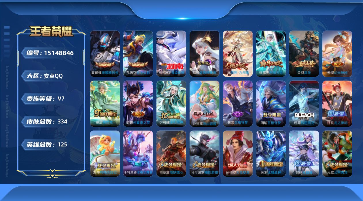 [15148846]可二次,【店主推荐捡漏号!可直接换绑】安卓Q-V7-至尊星耀V段位-125英雄-334皮肤-2典藏皮肤-1珍品传说-1星传说-7传说-85史诗 【英雄全皮】:孙权全皮,鬼谷子全皮,猪八戒全皮,蒙恬全皮,戈娅全皮,影全皮 【荣耀典藏】:孙悟空全息碎影,夏侯惇无限飓风号 【珍品传说】:马可波罗怪盗基德 【传说皮肤】:后羿神树通天,澜愿照九州拓,云缨幻光神枪,桑启鸣野蒿,诸葛亮时雨天司,关羽武圣,貂蝉仲夏夜之梦 【限定皮肤】:蒙犽顽岩魄,蔡文姬夏日便利店,虞姬夏日便利店,姜子牙天穹之誓,李白谪仙醉月,狄仁杰阴阳师,赵云皇家上将,墨子神迹守卫,孙尚香蔷薇恋人,庄周高山流水,高渐离死亡摇滚,钟无艳超时空战士,扁鹊奇幻香踪,元歌云间偶戏,元歌无心,夏侯惇朔风刀,甄姬游园惊梦,甄姬落雪兰心,马可波罗暗影游猎,狄仁杰魔术师,狄仁杰万华元夜,达摩星际陆战队,达摩沙漠行僧,项羽海滩派对,老夫子醍醐杖,老夫子航海奇遇记,关羽冰锋战神,关羽武圣,程咬金演武夺筹,兰陵王金庭之子,亚瑟潮玩骑士王,孙悟空大圣娶亲,后羿圣弓游侠,李元芳云中旅人,钟馗驱傩正仪,杨戬潮玩骑兵,干将莫邪冰霜恋舞曲,干将莫邪胡桃夹子,干将莫邪真爱魔法,雅典娜单词大作战,鬼谷子原初探秘者,鬼谷子五谷丰年,诸葛亮时雨天司,苏烈千军破阵,弈星混沌棋,沈梦溪大漠名商,裴擒虎李小龙,裴擒虎擒涛扼浪,米莱狄胡桃异想国,云中君纤云弄巧,猪八戒西部大镖客,猪八戒猪悟能,上官婉儿梁祝,嫦娥拒霜思,嫦娥暖冬兔眠,西施玲珑珍味,蒙犽狂想玩偶喵,鲁班大师探海日志,桑启海盐诗旅,暃星界游侠,戈娅驭风魔法,艾琳女武神,艾琳流音漫舞,司空震地狱燃心,阿古朵江河有灵,张良古海寻踪,蒙犽百解令,蒙恬荣光圣徽,鬼谷子天穹祈灯,沈梦溪龙舞盛年,刘邦剑破天穹,程咬金群星魔术团,周瑜熔金海岸 【年限皮肤】:诸葛亮时雨天司,关羽武圣 【赛季限定】:夏侯惇朔风刀,狄仁杰万华元夜,达摩沙漠行僧,老夫子醍醐杖,程咬金演武夺筹,兰陵王金庭之子,张良古海寻踪,李元芳云中旅人,钟馗驱傩正仪,鬼谷子原初探秘者,苏烈千军破阵,弈星混沌棋,沈梦溪大漠名商,裴擒虎擒涛扼浪,鲁班大师探海日志,桑启海盐诗旅,鬼谷子天穹祈灯,蒙恬荣光圣徽,刘邦剑破天穹,姜子牙天穹之誓 【战令限定】:墨子神迹守卫,蔡文姬夏日便利店,虞姬夏日便利店,钟无艳超时空战士,扁鹊奇幻香踪,元歌云间偶戏,甄姬落雪兰心