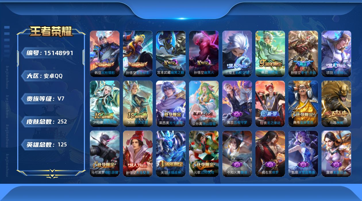 [15148991]可二次,【店主推荐捡漏号!可直接换绑,】,安卓Q-V7-最强王者段位-125英雄-252皮肤-2典藏皮肤-4传说-75史诗