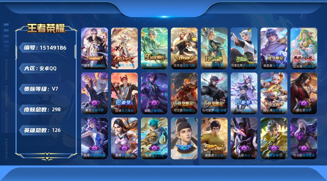 [15149186]可二次【店主推荐捡漏号!可直接换绑 万战阿珂 】 安卓Q-V7-最强王者段位-126英雄-298皮肤-1典藏皮肤-3传说-76史诗 【英雄全皮】:戈娅全皮,影全皮 【荣耀典藏】:诸葛亮星域神启 【传说皮肤】:澜愿照九州拓,桑启鸣野蒿,花木兰冠军飞将 【限定皮肤】:蒙犽顽岩魄,姜子牙天穹之誓,李白谪仙醉月,狄仁杰阴阳师,赵云皇家上将,墨子神迹守卫,孙尚香蔷薇恋人,阿轲迷踪丽影,钟无艳超时空战士,扁鹊奇幻香踪,吕布猎兽之王,元歌无心,甄姬落雪兰心,马可波罗暗影游猎,狄仁杰魔术师,狄仁杰万华元夜,达摩星际陆战队,项羽海滩派对,老夫子醍醐杖,老夫子航海奇遇记,程咬金演武夺筹,李元芳匿光侦查者,李元芳云中旅人,钟馗驱傩正仪,杨戬潮玩骑兵,雅典娜黎明之约,鬼谷子原初探秘者,百里玄策原初追逐者,裴擒虎李小龙,裴擒虎擒涛扼浪,米莱狄胡桃异想国,云中君纤云弄巧,嫦娥拒霜思,嫦娥暖冬兔眠,西施玲珑珍味,鲁班大师探海日志,桑启海盐诗旅,暃星界游侠,戈娅驭风魔法,艾琳流音漫舞,司空震地狱燃心,张良古海寻踪,蒙犽百解令,蒙恬荣光圣徽,高渐离燃音魔法,妲己灵卜魔法,鬼谷子天穹祈灯,姬小满妄想食味,沈梦溪龙舞盛年,鲁班七号蔬乡物语,李元芳蔬乡物语,刘邦剑破天穹,程咬金群星魔术团,镜青焰无极,项羽苍威无极,刘备异域游侠,周瑜熔金海岸 【赛季限定】:狄仁杰万华元夜,老夫子醍醐杖,程咬金演武夺筹,张良古海寻踪,李元芳云中旅人,钟馗驱傩正仪,雅典娜黎明之约,鬼谷子原初探秘者,百里玄策原初追逐者,裴擒虎擒涛扼浪,鲁班大师探海日志,桑启海盐诗旅,鬼谷子天穹祈灯,蒙恬荣光圣徽,刘邦剑破天穹,姜子牙天穹之誓 【战令限定】:墨子神迹守卫,阿轲迷踪丽影,钟无艳超时空战士,扁鹊奇幻香踪,吕布猎兽之王,甄姬落雪兰心,马可波罗暗影游猎,达摩星际陆战队,老夫子航海奇遇记,艾琳流音漫舞,杨戬潮玩骑兵,米莱狄胡桃异想国,嫦娥暖冬兔眠,西施玲珑珍味,司空震地狱燃心,暃星界游侠,戈娅驭风魔法,高渐离燃音魔法,妲己灵卜魔法,鲁班七号蔬乡物语,李元芳蔬乡物语,镜青焰无极,项羽苍威无极 【史诗皮肤】:露娜紫霞仙子,赵云皇家上将,赵云未来纪元,貂蝉圣诞恋歌,甄姬冰雪圆舞曲,王昭君偶像歌手,狄仁杰魔术师,廉颇地狱岩魂,宫本武藏鬼剑武藏,孙尚香蔷薇恋人,孙尚香水果甜心,妲己魅力维加斯,妲己女仆咖啡,墨子龙骑士,吕布圣诞狂欢,曹操幽灵船长,李
