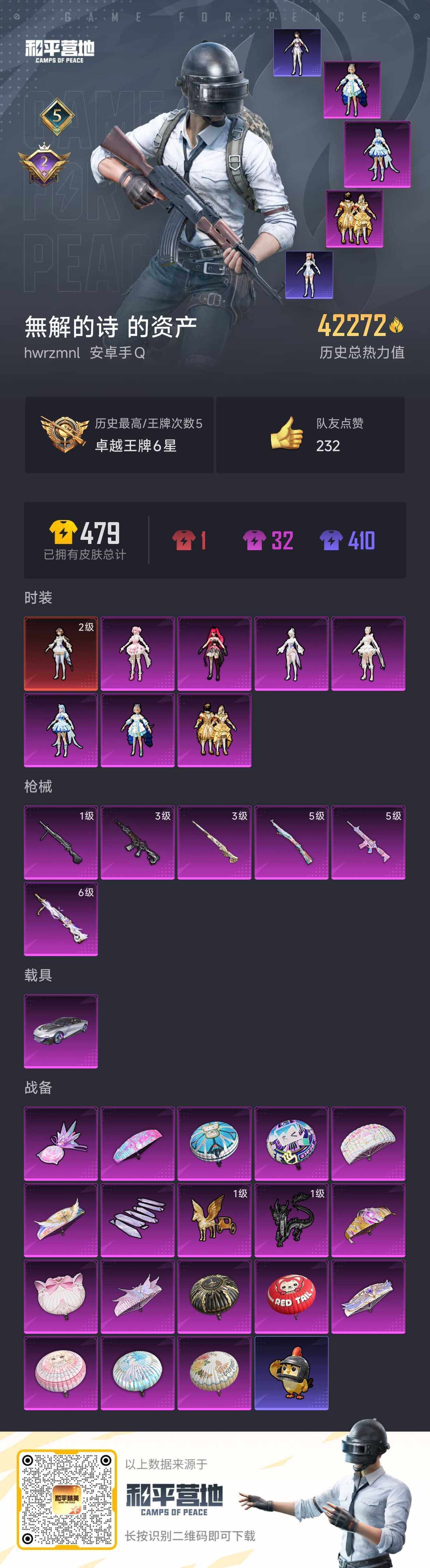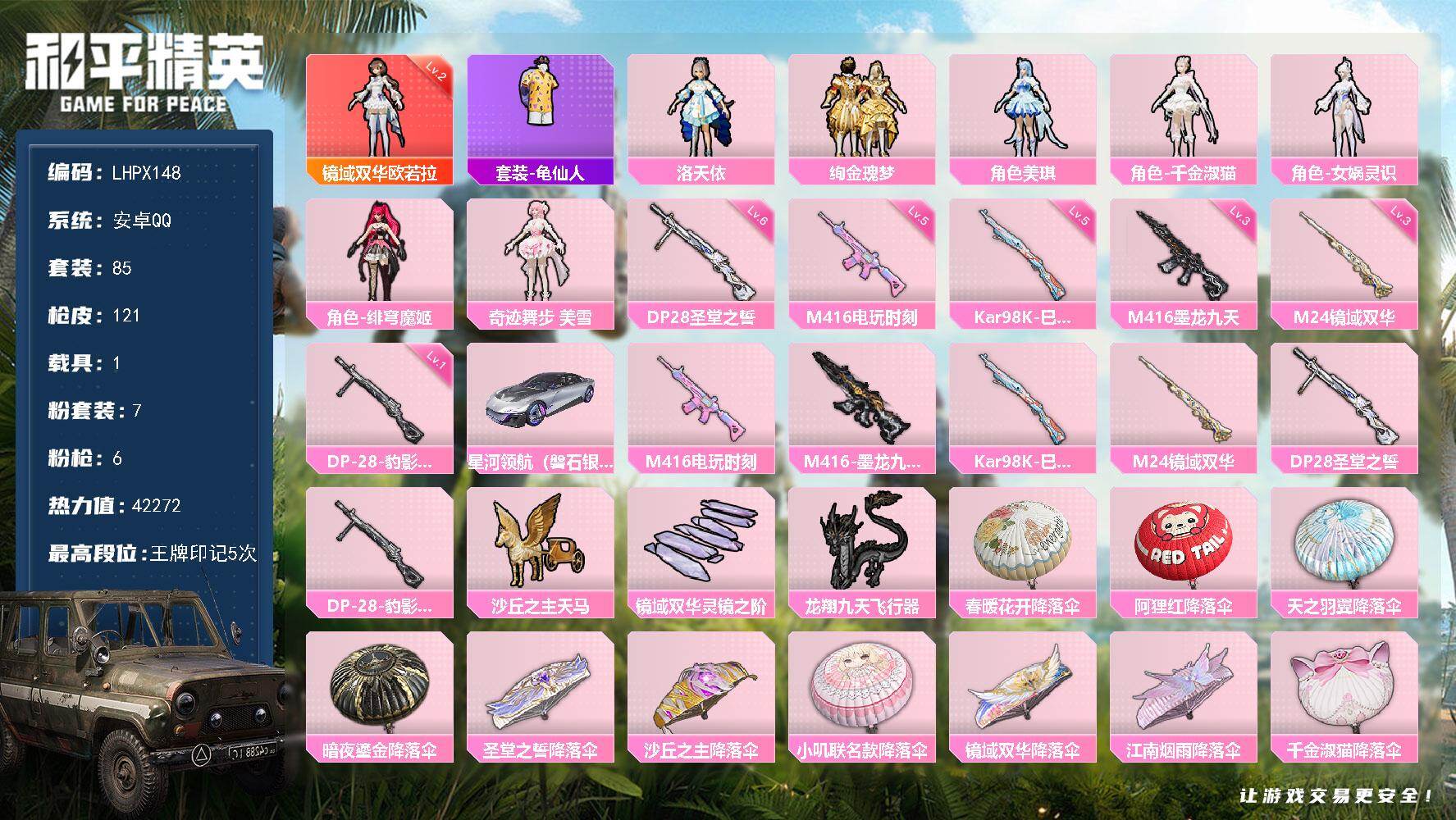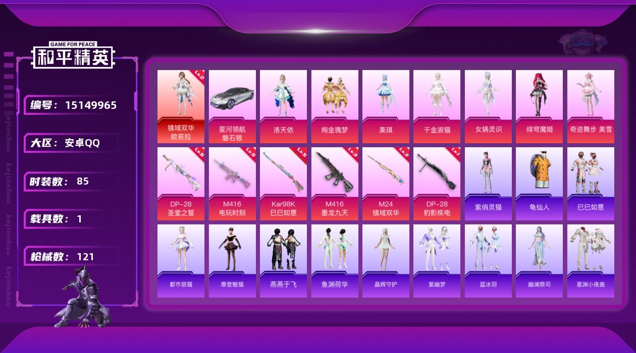 [15149965]【特价出售/店主推荐】 安卓 手Q-1神装-7粉装-6特效枪-1载具-4粉色飞行器-4.2w热力值-5王牌印记-85套装-121枪皮【红色神装等级】:镜域双华-欧若拉(二级)【红色角色神装】:镜域双华-欧若拉【热门品类】:套装-龟仙人【粉色套装】:角色-洛天依,粉装-绚金瑰梦,角色-美琪,角色-千金淑猫,角色-女娲灵识,角色-绯穹魔姬,角色-奇迹舞步 美雪【粉色枪皮等级】:M416-电玩时刻(五级),M416-墨龙九天(三级),Kar98K-巳巳如意(五级),M24-镜域双华(三级),DP-28-圣堂之誓(六级),DP-28-豹影疾电(一级)【粉色载具】:星河领航(磐石银)【粉色枪皮】:M416-电玩时刻,M416-墨龙九天,Kar98K-巳巳如意,M24-镜域双华,DP-28-圣堂之誓,DP-28-豹影疾电【粉色飞行器】:沙丘之主天马,镜域双华-灵镜之阶,龙翔九天飞行器