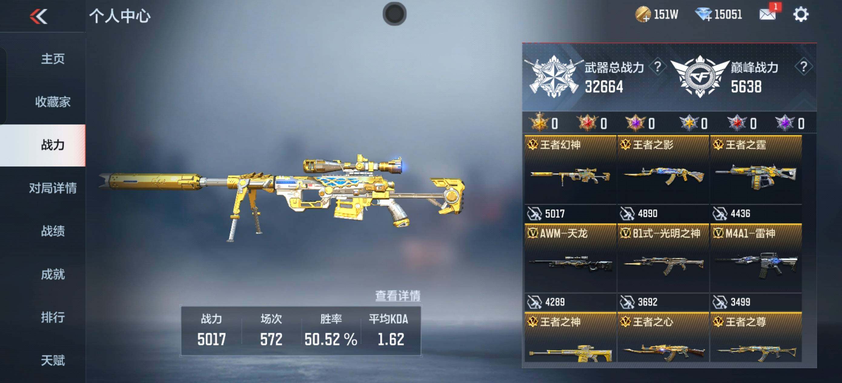 [15149996]5英雄角色数-142英雄武器数 【王者系列】:王者之影,王者之心,王者之神,王者之迹,王者之魂,王者幻神,王者之霆 【热门武器】:81式-光明之神 【角色】:樱,关小雨*2,春节兰-X,钟小魁 【英雄武器】:AK47-沙漠领主*2,AK47-血武士,AK47-木兰,AK47-塔罗牌觉醒,AK47-谜城烟火,M4A1-雷神,M4A1-黑骑士,M4A1-死神*2,M4A1-机械迷城,M4A1-海骑士,M4A1-运输船,M4A1-千变,M4A1-太白诗仙,M4A1-铁胆虎魄,SCAR-幽暗骑士,SCAR-幽暗骑士觉醒,SCAR-探星者,M14EBR-天神,M14EBR-拂影,M14EBR-葫芦山庄,AK12-天启,QBZ03-金色蔷薇*4,QBZ03-死神,HK417-炎龙铠甲,81式-光明之神,G3A3-衍神兵*2,AWM-天龙,AWM-大湾溢彩,巴雷特-毁灭*2,巴雷特-极光,09式狙-天神,MR1-龙吟惊沧海,RPK-盘龙,RPK-美杜莎,加特林-堡垒,汤姆逊-烈龙,寒霜烈龙,双持斯泰尔-天使,地狱火,贝雷塔-力拔山河,M1887-幽冥玄喵觉醒,Origin12-机变奇蛇觉醒,USP-神罚,USP-机械迷城,USP-太白诗仙,USP-耀金伯爵,沙鹰-修罗*2,沙鹰-宇航兔兔,改装GLOCK-木兰,左轮-卧龙觉醒,GLOCK18-猎神,柯尔特-仲达,柯尔特-伏刹山海觉醒,女皇利刃-铁胆虎魄,龙啸,神罚战斧,手斧-机械迷城,屠龙*6,尼泊尔-火麒麟,穷奇铁扇,太白诗仙扇,星芒,马来剑-毁灭*2,唐刀-大唐荣耀,擎天