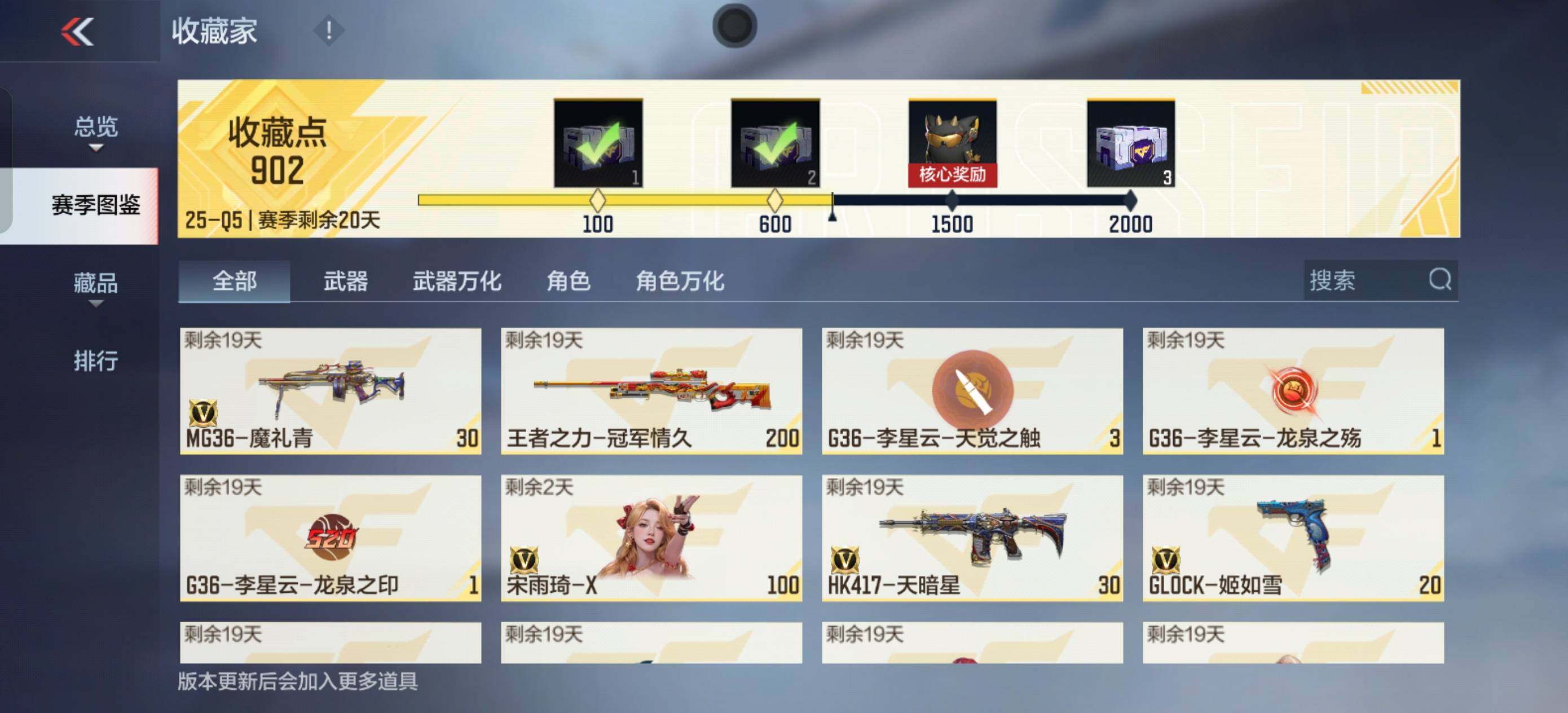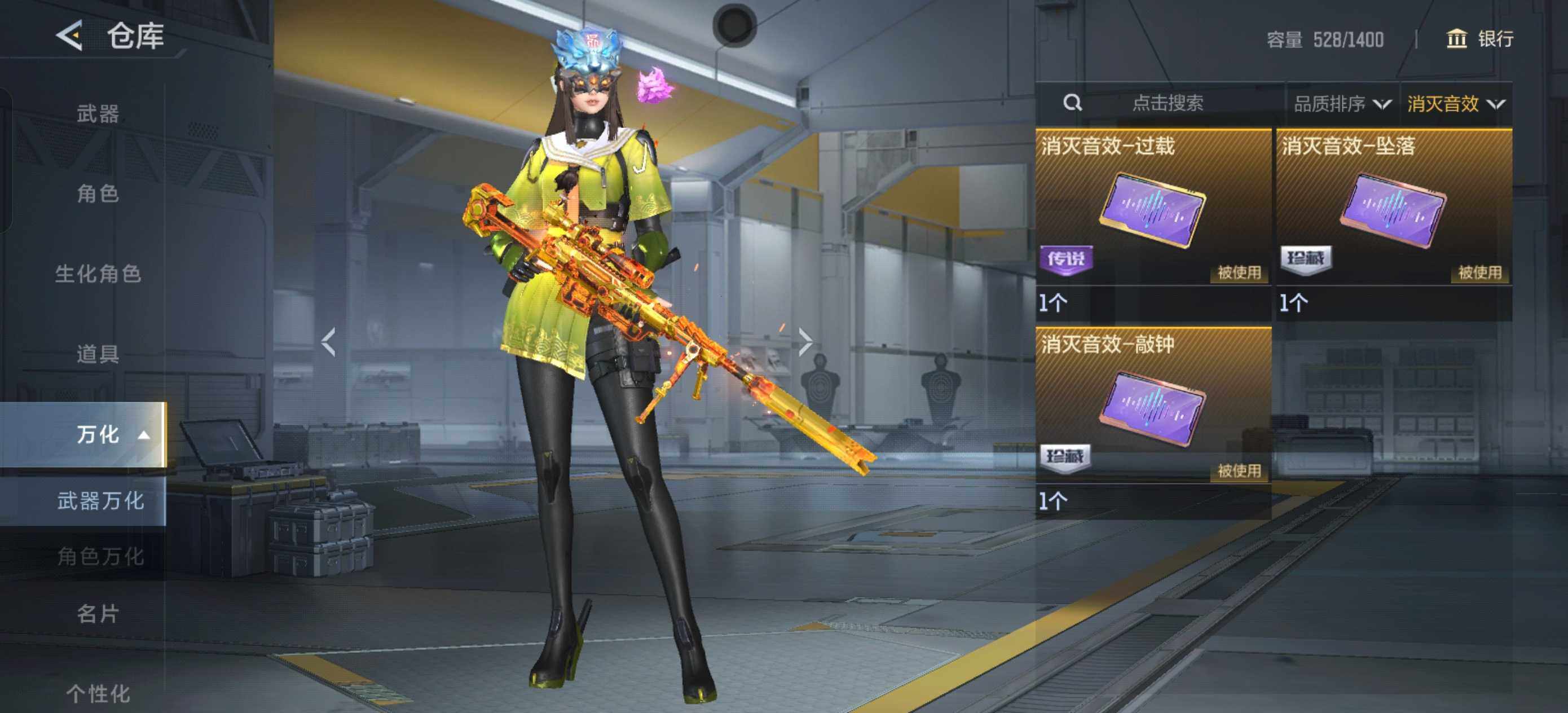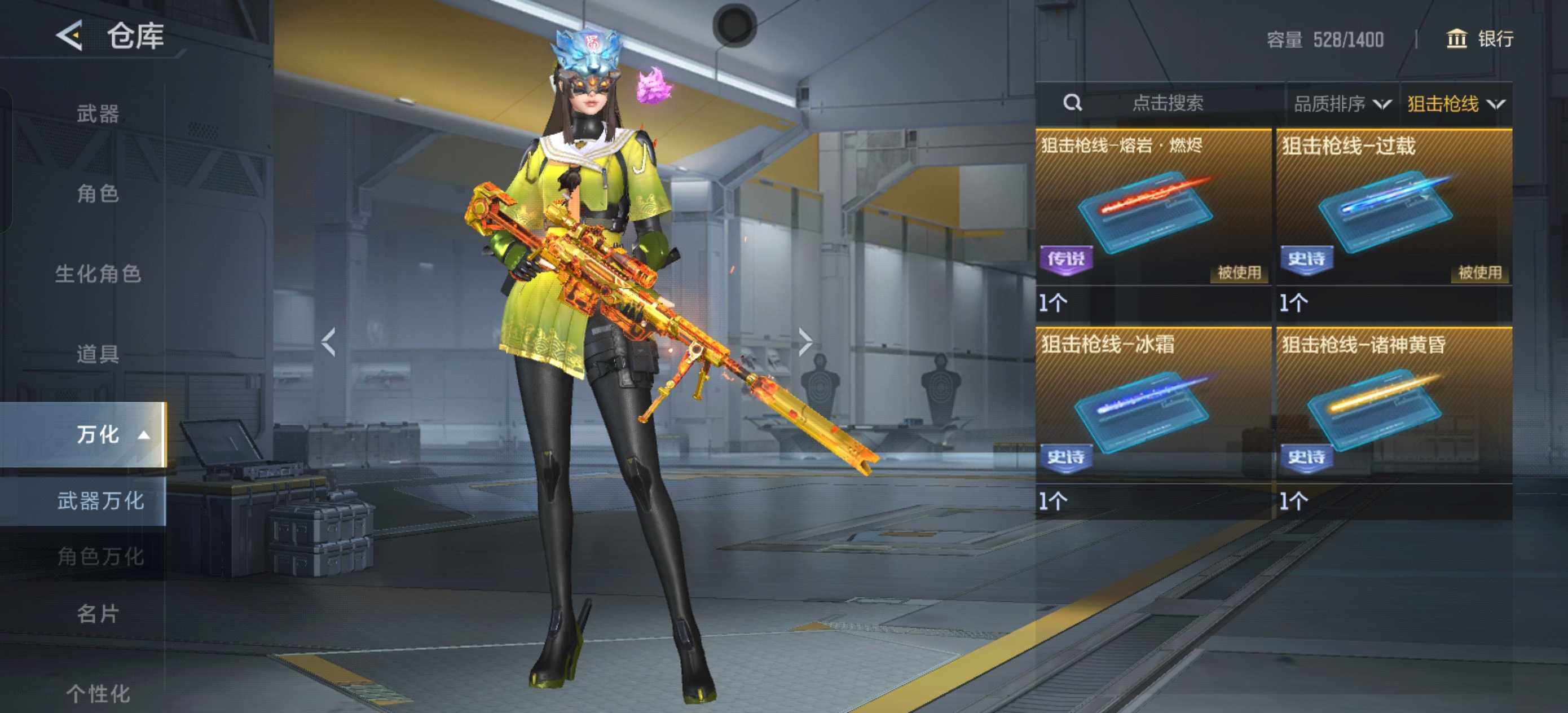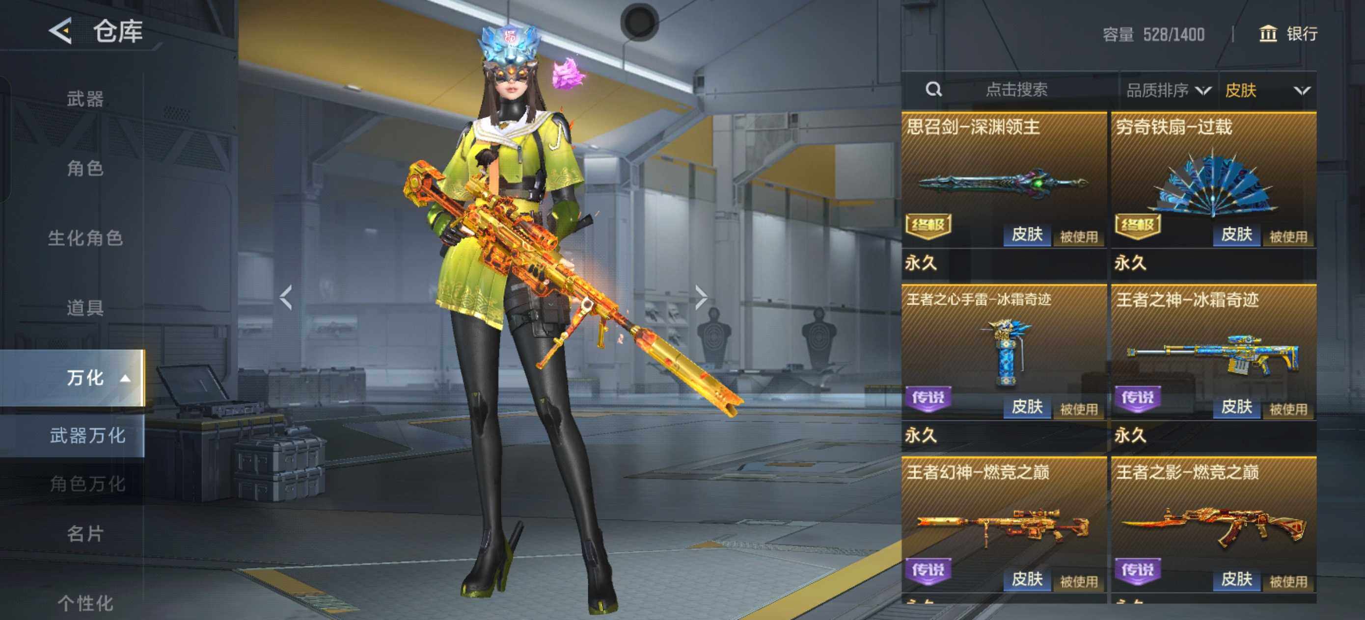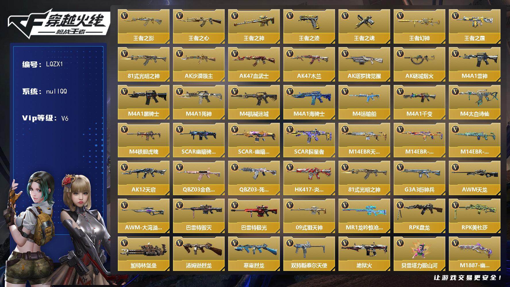 【英雄武器】:AK47-沙漠领主*2,AK47-血武士,AK47-木兰,AK47-塔罗牌觉醒,AK47-谜城烟火,M4A1-雷神,M4A1-黑骑士,M4A1-死神*2,M4A1-机械迷城,M4A1-海骑士,M4A1-运输船,M4A1-千变,M4A1-太白诗仙,M4A1-铁胆虎魄,SCAR-幽暗骑士,SCAR-幽暗骑士觉醒,SCAR-探星者,M14EBR-天神,M14EBR-拂影,M14EBR-葫芦山庄,AK12-天启,QBZ03-金色蔷薇*4,QBZ03-死神,HK417-炎龙铠甲,81式-光明之神,G3A3-衍神兵*2,AWM-天龙,AWM-大湾溢彩,巴雷特-毁灭*2,巴雷特-极光,09式狙-天神,MR1-龙吟惊沧海,RPK-盘龙,RPK-美杜莎,加特林-堡垒,汤姆逊-烈龙,寒霜烈龙,双持斯泰尔-天使,地狱火,贝雷塔-力拔山河,M1887-幽冥玄喵觉醒,Origin12-机变奇蛇觉醒,USP-神罚,USP-机械迷城,USP-太白诗仙,USP-耀金伯爵,沙鹰-修罗*2,沙鹰-宇航兔兔,改装GLOCK-木兰,左轮-卧龙觉醒,GLOCK18-猎神,柯尔特-仲达,柯尔特-伏刹山海觉醒,女皇利刃-铁胆虎魄,龙啸,神罚战斧,手斧-机械迷城,屠龙*6,尼泊尔-火麒麟,穷奇铁扇,太白诗仙扇,星芒,马来剑-毁灭*2,唐刀-大唐荣耀,擎天