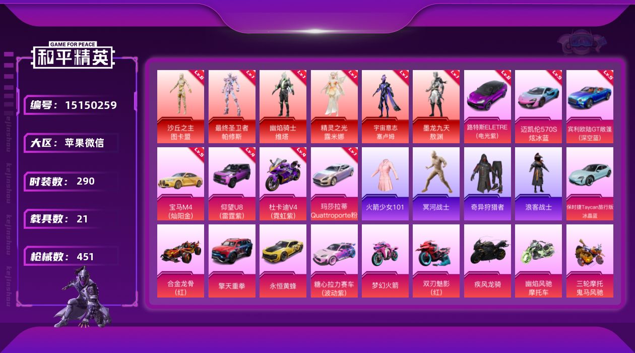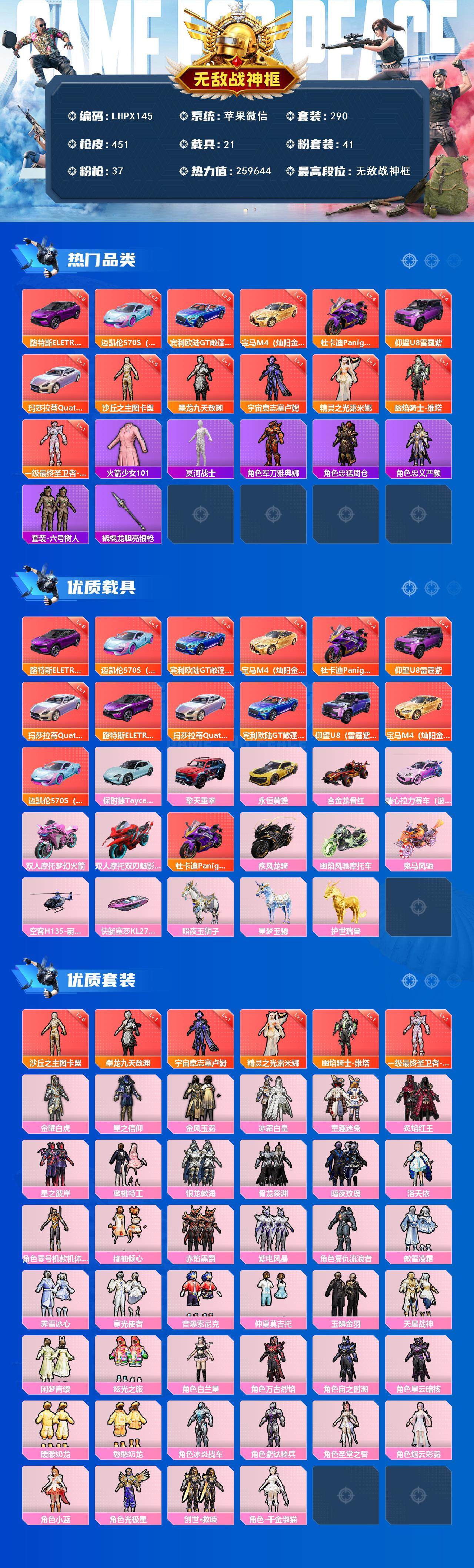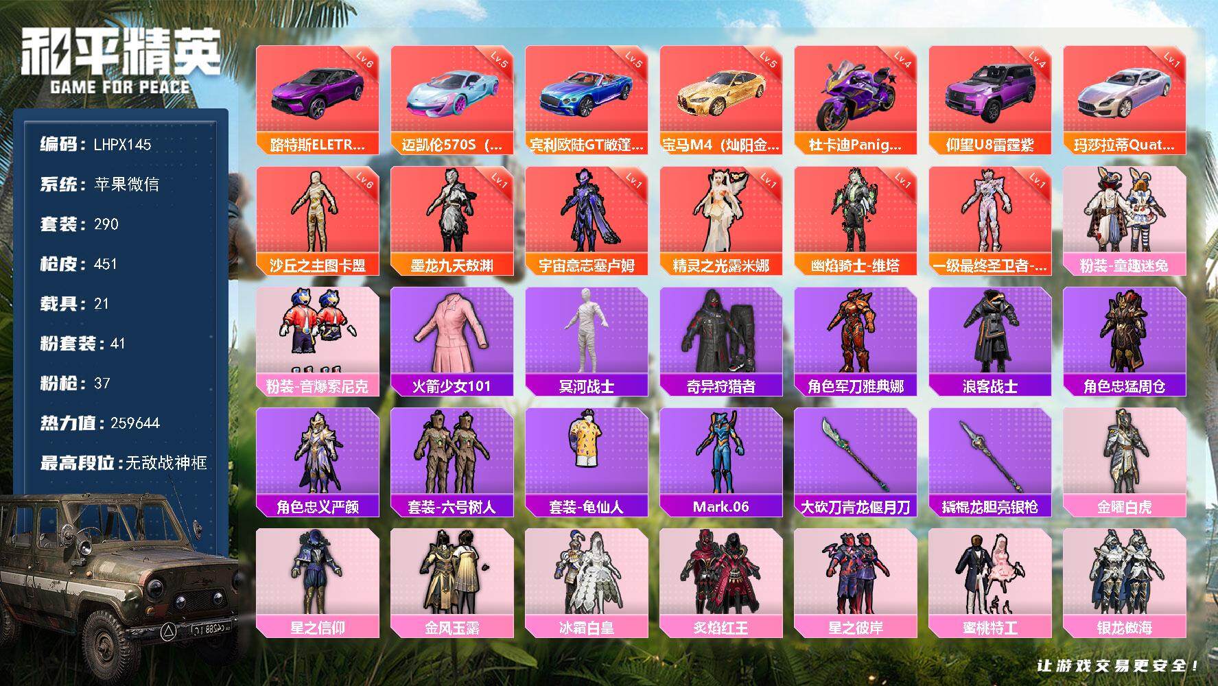 [15150259]6套6级红装可随意切换 老101 满级AUG星梦 满级m4超新星 满级ak幽焰骑士【特价出售/店主推荐】苹果 微信-无敌战神框-6神装-41粉装-37特效枪-21载具-16粉色飞行器-259644热力值-26王牌印记-290套装-451枪皮 【红色载具】:路特斯ELETRE(电光紫)(六级),玛莎拉蒂Quattroporte(幻星粉)(一级),迈凯伦570S(炫冰蓝)(五级),宾利欧陆GT敞篷(深空蓝)(五级),杜卡迪 Panigale V4(霓虹紫)(四级),仰望U8(雷霆紫)(四级),宝马M4(灿阳金)(五级) 【红色神装等级】:沙丘之主-图卡盟(六级)最终圣卫者-帕修斯(一级),幽焰骑士-维塔(一级),精灵之光-露米娜(一级),宇宙意志-塞卢姆(一级),墨龙九天-敖渊(一级) 【红色角色神装】:最终圣卫者-帕修斯,幽焰骑士-维塔,精灵之光-露米娜,宇宙意志-塞卢姆,墨龙九天-敖渊,沙丘之主-图卡盟 【热门品类】:粉装-童趣迷兔,粉装-音爆索尼克,套装-火箭少女101,套装-冥河战士,套装-奇异狩猎者,角色-军刀雅典娜,套装-浪客战士,角色-忠猛周仓,角色-忠义严颜,套装-六号树人,套装-龟仙人,角色-Mark.06,大砍刀-青龙偃月刀,撬棍-龙胆亮银枪 【粉色套装】:粉装-金曜白虎,粉装-星之信仰,粉装-金风玉露,粉装-冰霜白皇,粉装-童趣迷兔,粉装-炙焰红王,粉装-星之彼岸,粉装-蜜桃特工,粉装-银龙傲海,粉装-骨龙祭渊,粉装-暗夜玫瑰,角色-洛天依,角色-零号机款机体服,粉装-橘柚倾心,粉装-赤焰黑爵,粉装-紫电风暴,角色-复仇流浪者,粉装-傲雪凌霜,粉装-霁雪冰心,粉装-寒光使者,粉装-音爆索尼克,粉装-仲夏莫吉托,粉装-玉鳞金羽,粉装-天星战神,粉装-闲梦青缨,粉装-炫光之旅,角色-白兰星,角色-万古烈焰,角色-宙之时溯,角色-星云暗核,粉装-暖暖奶龙,粉装-憨憨奶龙,角色-冰炎战车,角色-紫钛骑兵,角色-圣堂之誓,角色-烟云彩露,角色-小蓝,角色-光极星,套装-创世·救赎,角色-千金淑猫 【粉色枪皮等级】:AKM-炫紫旋律(一级),AKM-绿萝繁花(四级),AKM-熔岩统帅(一级),AKM-幽焰骑士(九级),M16A4-葫芦兄弟(一级),SCAR-L-童趣迷兔(六级),SCAR-L-金蛇镇世(三级),M416-心之恋语(一级),M416-超新星(九