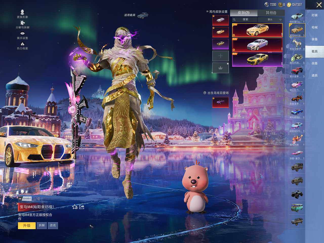 路特斯ELETRE(电光紫),玛莎拉蒂Quattroporte(幻星粉),宾利欧陆GT敞篷(深空蓝),仰望U8(雷霆紫),宝马M4(灿阳金),迈凯伦570S(炫冰蓝),擎天重拳,永恒黄蜂,合金龙骨(红),糖心拉力赛车(波动紫),双人摩托-梦幻火箭,双人摩托-双刃魅影(红),杜卡迪_Panigale_V4(霓虹紫),疾风龙骑,幽焰风驰摩托车,鬼马风驰,空客H135-蔚蓝之翼,快艇-塞莎KL27(霓虹粉),照夜玉狮子,星梦玉骢,护世瑞兽