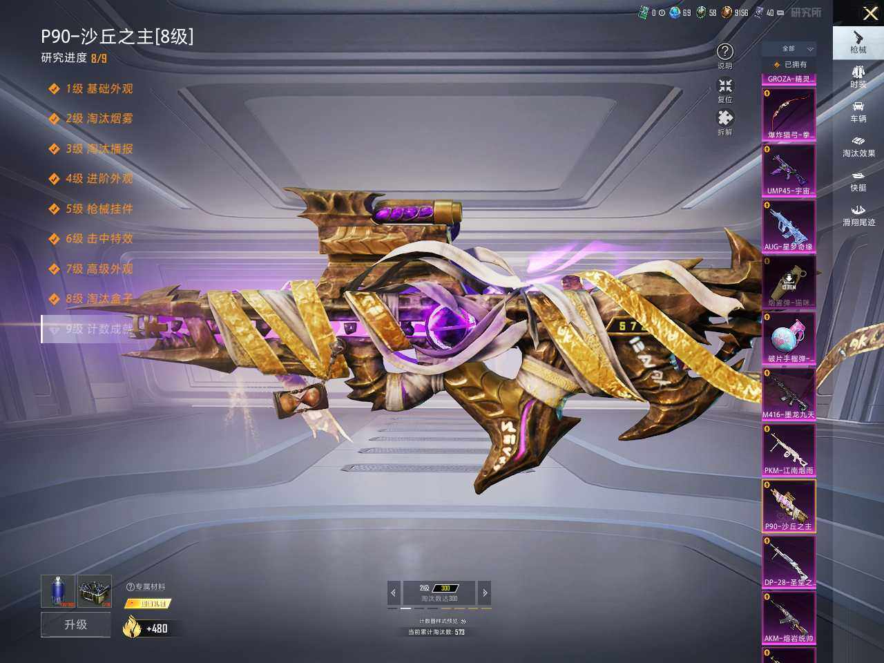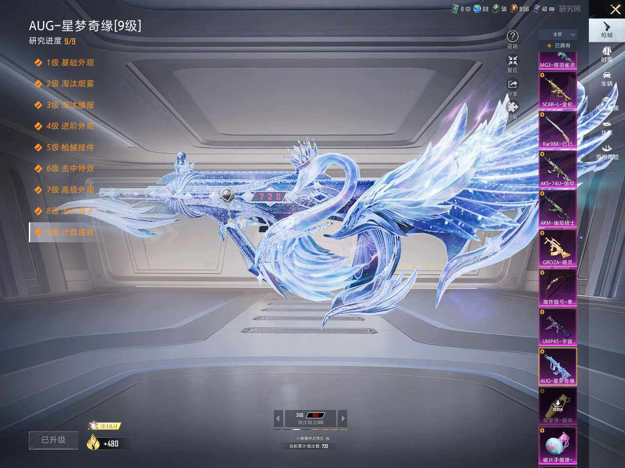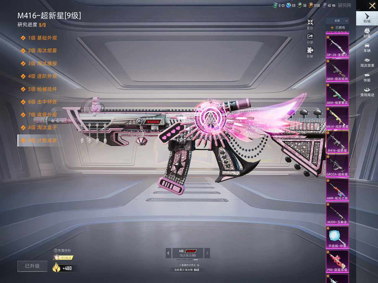 【粉色枪皮等级】:AKM-炫紫旋律(一级),AKM-绿萝繁花(四级),AKM-熔岩统帅(一级),AKM-幽焰骑士(九级),M16A4-葫芦兄弟(一级),SCAR-L-童趣迷兔(六级),SCAR-L-金蛇镇世(三级),M416-心之恋语(一级),M416-超新星(九