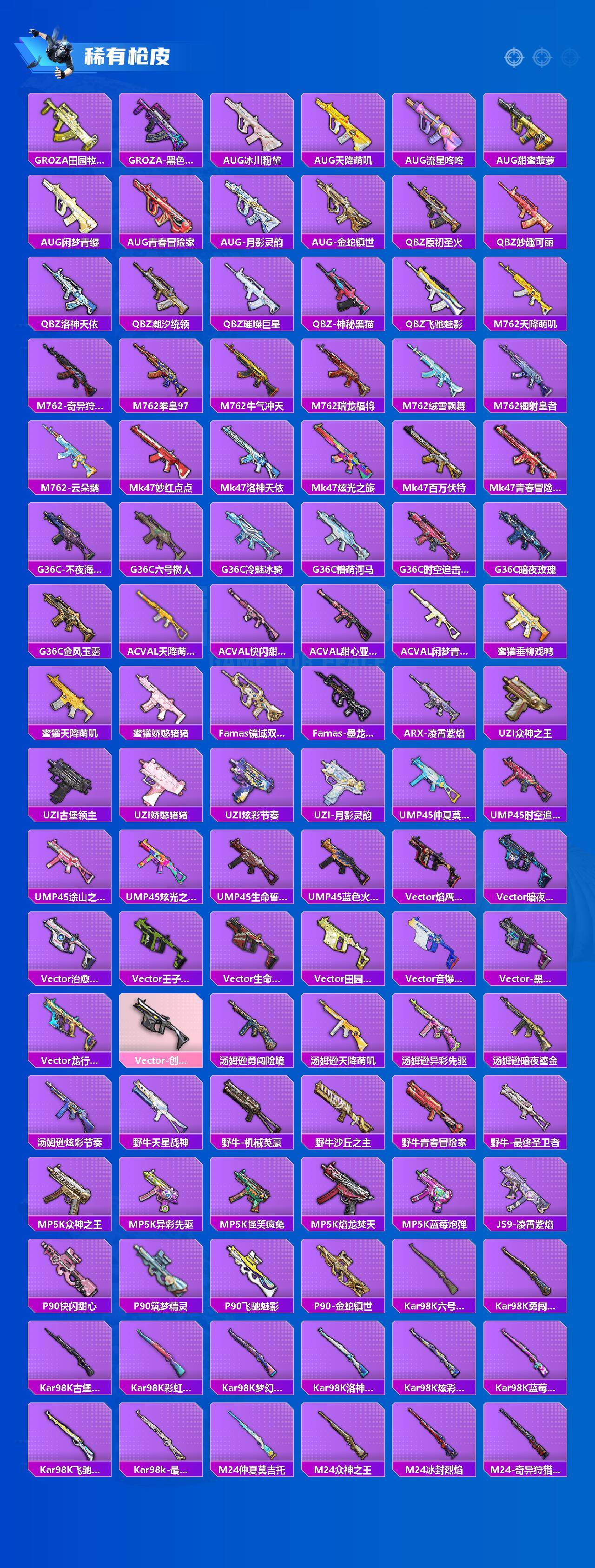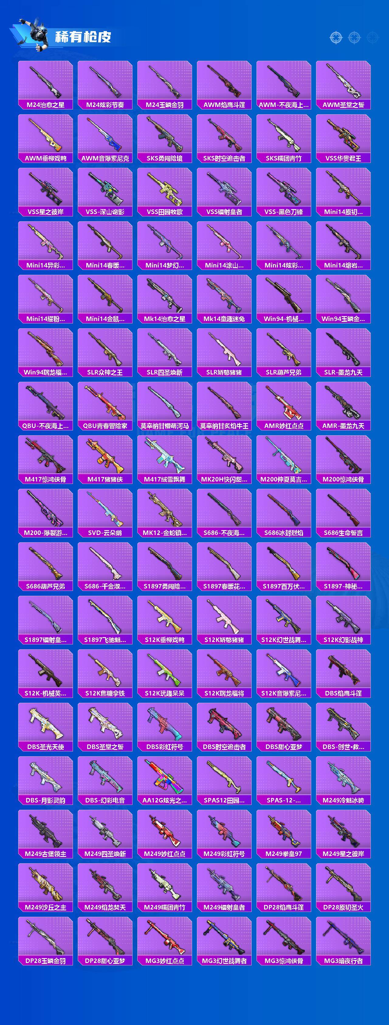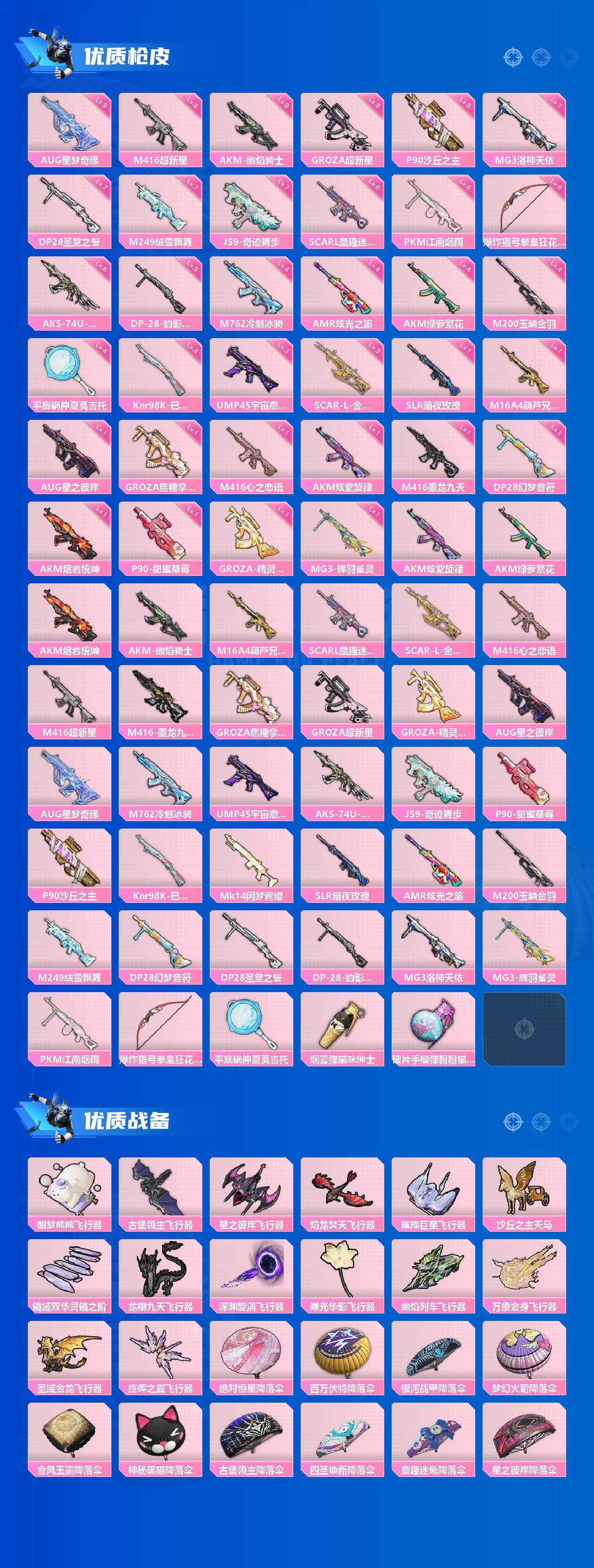 AKM-炫紫旋律,AKM-绿萝繁花,AKM-熔岩统帅,AKM-幽焰骑士,M16A4-葫芦兄弟,SCAR-L-童趣迷兔,SCAR-L-金蛇镇世,M416-心之恋语,M416-超新星,M416-墨龙九天,GROZA-焦糖拿铁,GROZA-超新星,GROZA-精灵之光,AUG-星之彼岸,AUG-星梦奇缘,M762-冷魅冰骑,UMP45-宇宙意志,AKS-74U-信仰神谕,P90-甜蜜草莓,P90-沙丘之主,Kar98K-巳巳如意,Mk14-闲梦青缨,SLR-暗夜玫瑰,AMR-炫光之旅,M200-玉鳞金羽,M249-绒雪飘舞,DP-28-幻梦音符,DP-28-圣堂之誓,MG3-洛神天依,PKM-江南烟雨,爆炸猎弓-拳皇·狂花道,平底锅-仲夏莫吉托,烟雾弹-猫咪绅士,破片手榴弹-粉粉猫爪