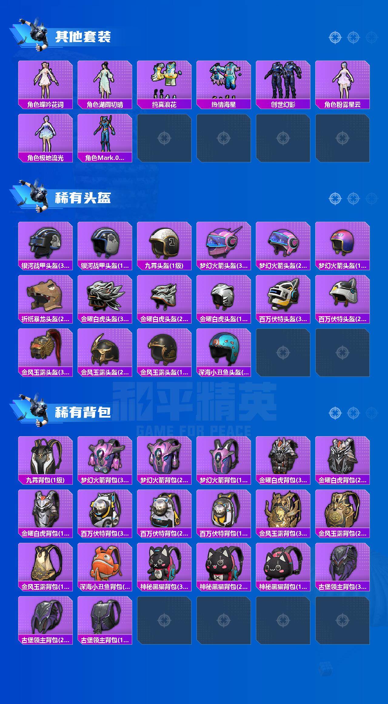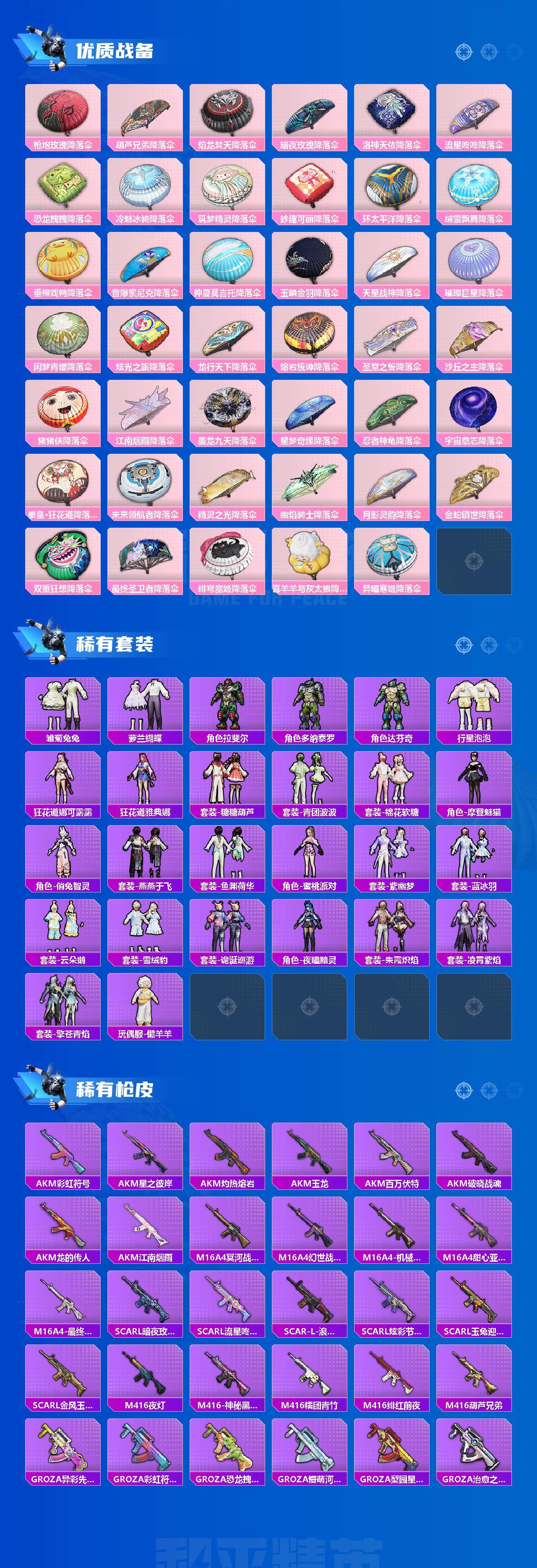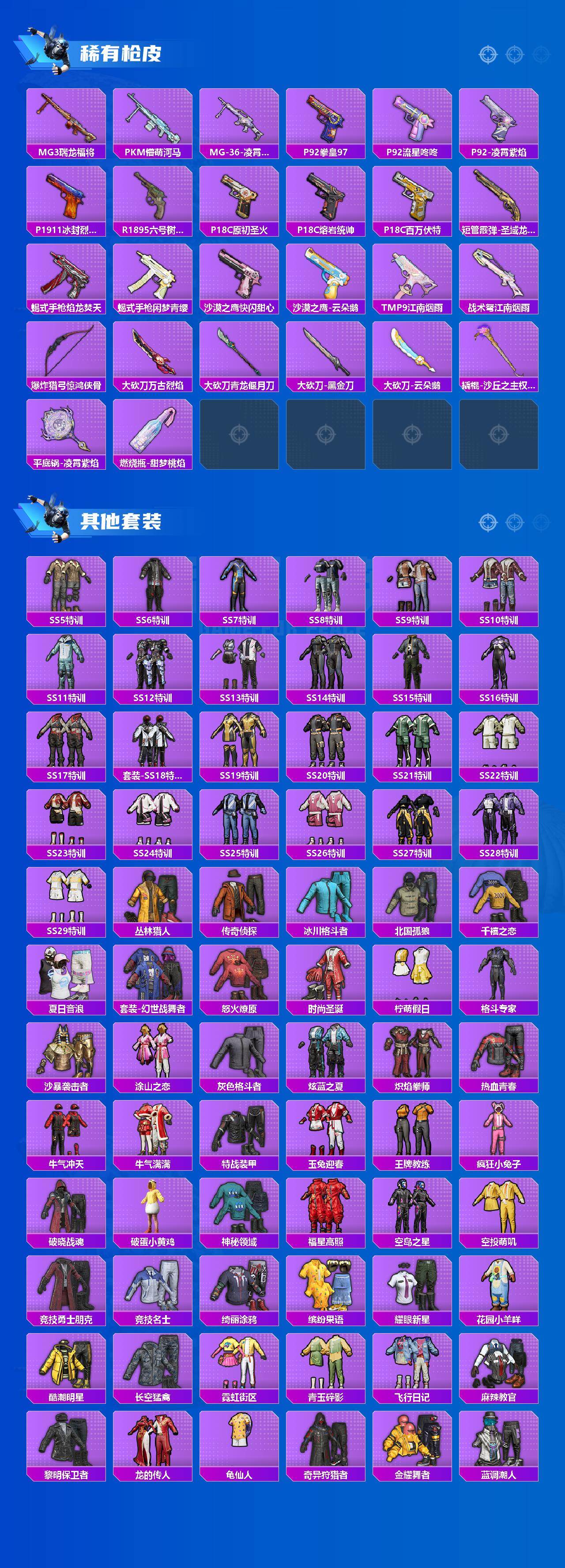 - [11604444]1红装 6粉装 4特效枪 16印记 可二次 可修改实名 优质装备:圣域龙灵-瑞拉,三级圣域龙灵-瑞拉(3级瑞拉),僚机-圣域龙宝,星之彼岸,DP-28-千金淑猫,七级DP-28-千金淑猫,萨利娅,Kar98K-圣域龙灵,凤凰座 一辉,Kar98K-巳巳如意 热门装扮:青空秋雨,鸢尾晶梦,金丰海韵 五级特效枪:五级Kar98K-巳巳如意 四级特效枪:四级DP-28-豹影疾电 三级特效枪:三级Kar98K-圣域龙灵 紫色装扮:田园牧歌,轻风白浪,SS22特训,和煦暖阳,飞狐塔尔斯,妙红点点,灵蜜圈圈,幻彩翩翩,SS23特训,俏皮奶喵,娇憨猪猪,萌趣咩咩,暖心熊熊,SS21特训,SS30特训套装,人气偶像,冷焰舞者,北国孤狼,SS20特训,SS31特训套装,雪绒豹,SS33特训套装,灵公主,快乐星愿,SS16特训,星梦畅游,SS13特训,SS14特训,SS19特训,电音精灵,SS17特训,SS18特训,坚韧舞者,长空猛禽,都市魅力,酒红色名流,野性战心,霓虹街区,青年教官,耀眼新星,荣耀,蓝彩潮人,蓝色守护者,蓝色运动,虎虎生威吉莉,街头潮人,跃动心情,龙的传人,飞行日记,骑行爱好者,魅力单车,鹤鸣,麻辣教官,黄色伏地魔,黄色名流,黄色运动,黎明保卫者,黑色伏地魔,龟仙人,冰河战士,龙魂突击队,蝶变,香桃花海,绮丽涂鸦,极速红龙,柠萌假日,格斗先锋,橘黑制服,沙漠兵团,活力之心,海岛探路者,涂山之恋,深蓝色名流,湖蓝色名流,幻世战舞者,完美偶像,帅气教官,幻影武者,怒火燎原,战地督导,探宝勇士,滨海假日,甜蜜熊情侣,白色伏地魔,破晓战魂,破蛋小黄鸡,王牌教练,福星高照,空岛之星,空投萌叽,竞技勇士朋克,竞技达人朋克,红色运动,甜蜜告白,猛禽,滨海厨神,灰色格斗者,灼焰舞者,炫蓝之夏,热血青春,牛气冲天,猎鹰,牛气满满,湖畔霞光,小熊娃娃,雏菊兔兔,萝兰蝴蝶,SS29特训,银尘,纯真浪花,热情海星,曼妙人鱼,SS28特训,迎夏光舞,星途旅人,巳巳如意,石蕴玉辉,鱼渊荷华,玉兔迎春,燕燕于飞,森林游猎者,青团波波,糖糖葫芦,棉花软糖,竞技名士,都市丽猫,摩登魅猫,街头风暴,智谋强哥,惊鸿侠骨,SS25特训,甜梦熊熊,神气柴柴,懵萌河马,SS24特训(SS24特训套装),锦衣飞扬,绝对偶像,金戈铁马,SS27特训,粉红小猪,SS26特训,新侠客行,SS12特训,耀粉歌者
