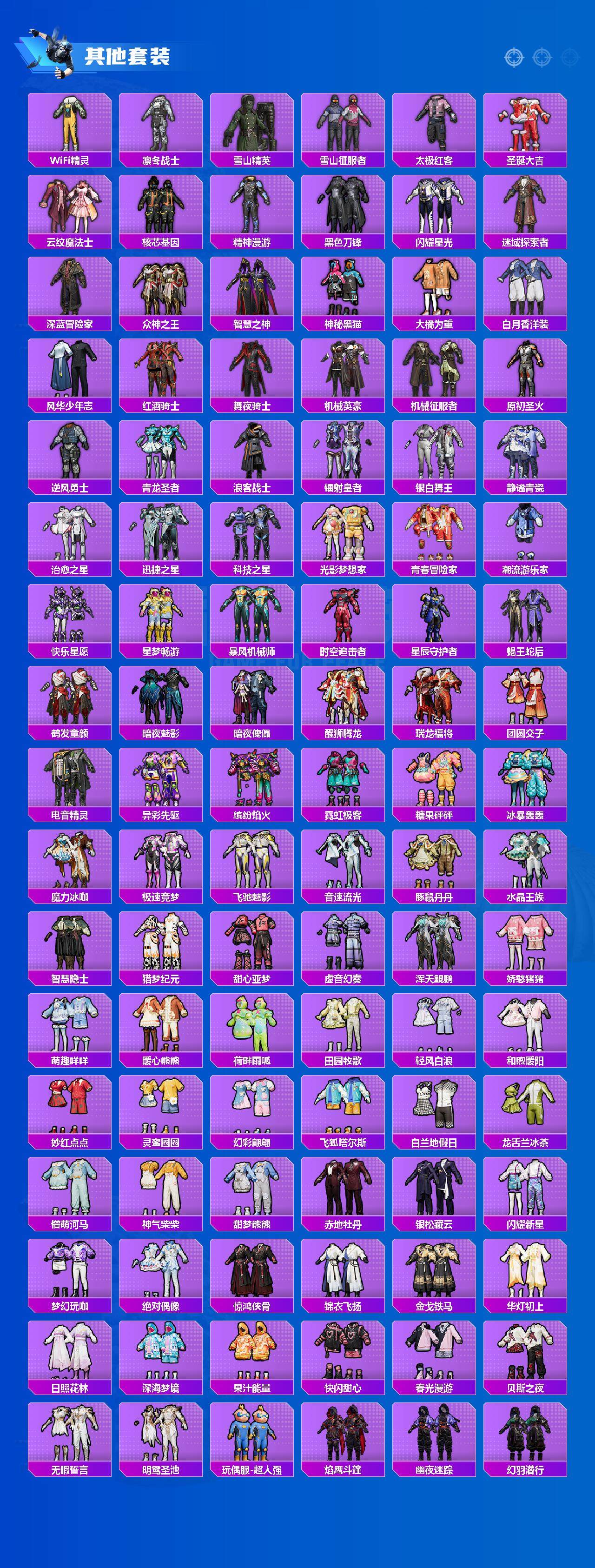 【粉色套装】:粉装-金曜白虎,粉装-星之信仰,粉装-金风玉露,粉装-冰霜白皇,粉装-童趣迷兔,粉装-炙焰红王,粉装-星之彼岸,粉装-蜜桃特工,粉装-银龙傲海,粉装-骨龙祭渊,粉装-暗夜玫瑰,角色-洛天依,角色-零号机款机体服,粉装-橘柚倾心,粉装-赤焰黑爵,粉装-紫电风暴,角色-复仇流浪者,粉装-傲雪凌霜,粉装-霁雪冰心,粉装-寒光使者,粉装-音爆索尼克,粉装-仲夏莫吉托,粉装-玉鳞金羽,粉装-天星战神,粉装-闲梦青缨,粉装-炫光之旅,角色-白兰星,角色-万古烈焰,角色-宙之时溯,角色-星云暗核,粉装-暖暖奶龙,粉装-憨憨奶龙,角色-冰炎战车,角色-紫钛骑兵,角色-圣堂之誓,角色-烟云彩露,角色-小蓝,角色-光极星,套装-创世·救赎,角色-千金淑猫