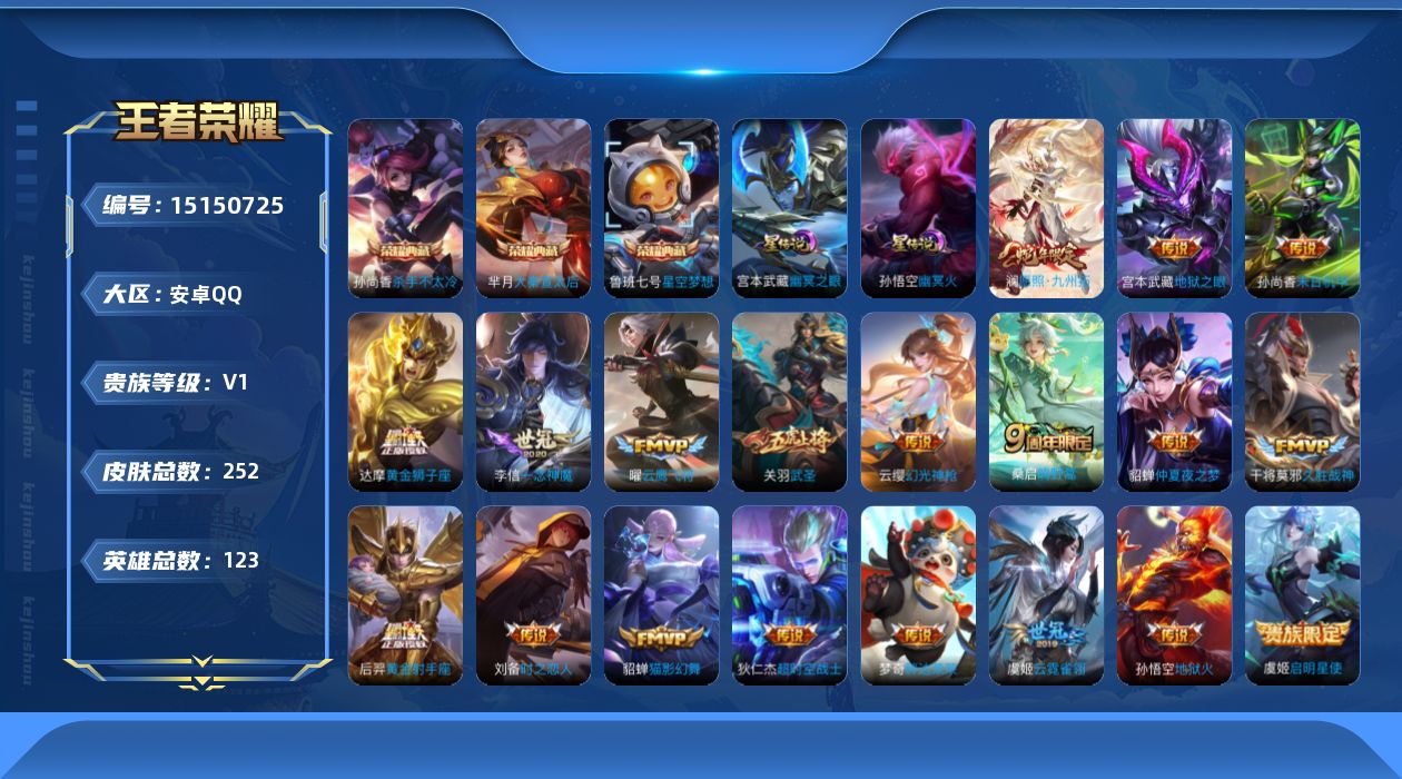 [15150725]可二次【店主推荐捡漏号!可直接换绑/3145星币可兑换星元皮肤】:安卓Q-V8-最强王者段位-121英雄-252皮肤-3典藏皮肤-2星元-19传说-71史诗
