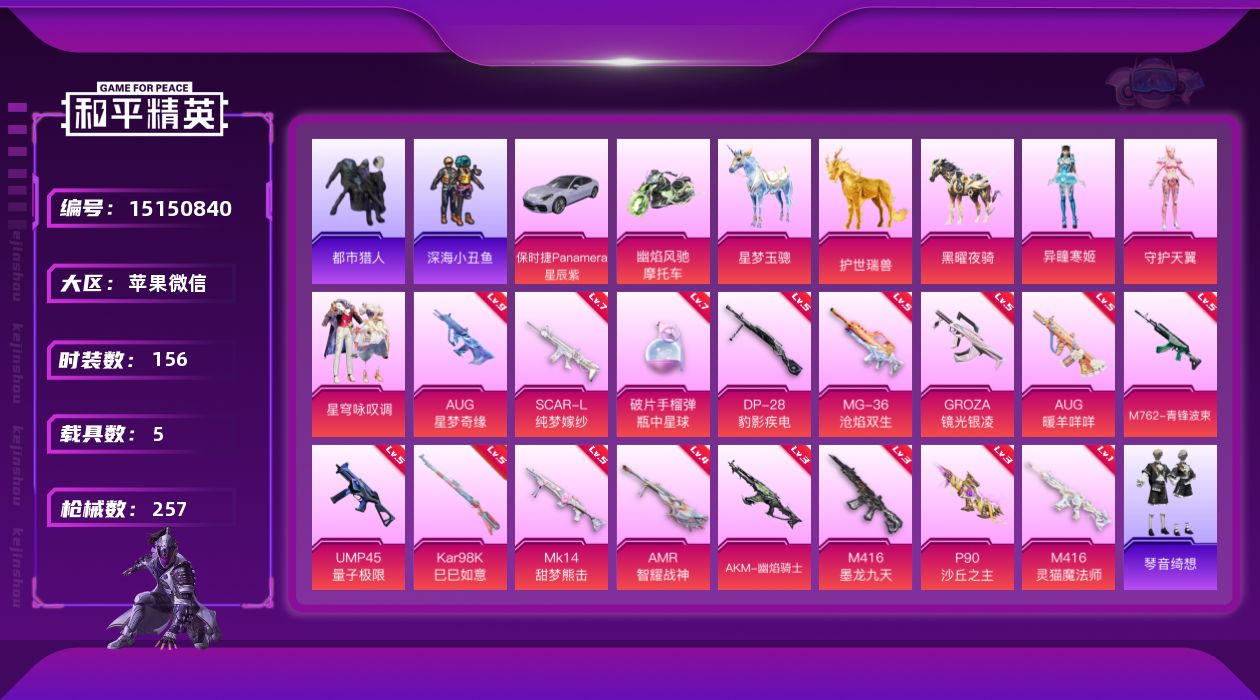 [15150840]素材身法号/地铁满天赋/AUG-星梦奇缘(九级) 苹果 微信-3粉装-16特效枪-5载具-8粉色飞行器-8.2w热力值-16王牌印记-156套装-257枪皮【热门品类】:套装-浪漫天命,套装-都市猎人,套装-深海小丑鱼,套装-龟仙人,套装-暗影哥特,角色-8号机,角色-Mark.06【粉色载具】:保时捷Panamera(星辰紫),幽焰风驰摩托车,星梦玉骢,护世瑞兽,黑曜夜骑【粉色套装】:角色-守护天翼,粉装-星穹咏叹调,角色-异瞳寒姬【粉色枪皮等级】:AKM-幽焰骑士(三级),SCAR-L-纯梦嫁纱(七级),M416-墨龙九天(三级),M416-灵猫魔法师(一级),GROZA-镜光银凌(五级),AUG-星梦奇缘(九级),AUG-暖羊咩咩(五级),M762-青锋波束(五级),UMP45-量子极限(五级),P90-沙丘之主(三级),Kar98K-巳巳如意(五级),Mk14-甜梦熊击(五级),AMR-智耀战神(四级),DP-28-豹影疾电(五级),MG-36-沧焰双生(五级),破片手榴弹-瓶中星球(七级)【粉色飞行器】:酣梦熊熊飞行器,镜域双华-灵镜之阶,龙翔九天飞行器,幽焰列车飞行器,万象金身飞行器,灵猫魔法师飞行器