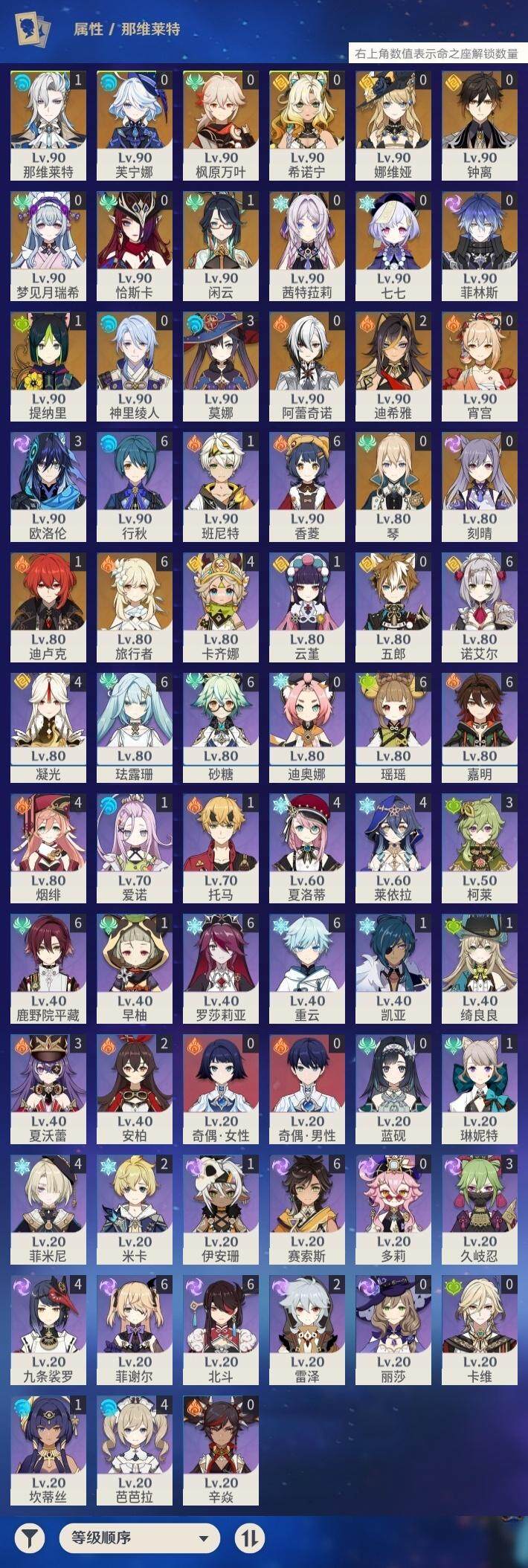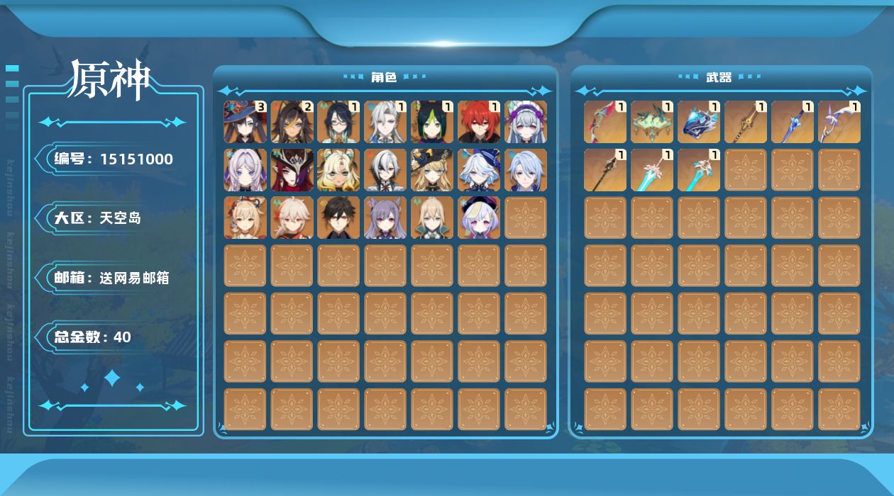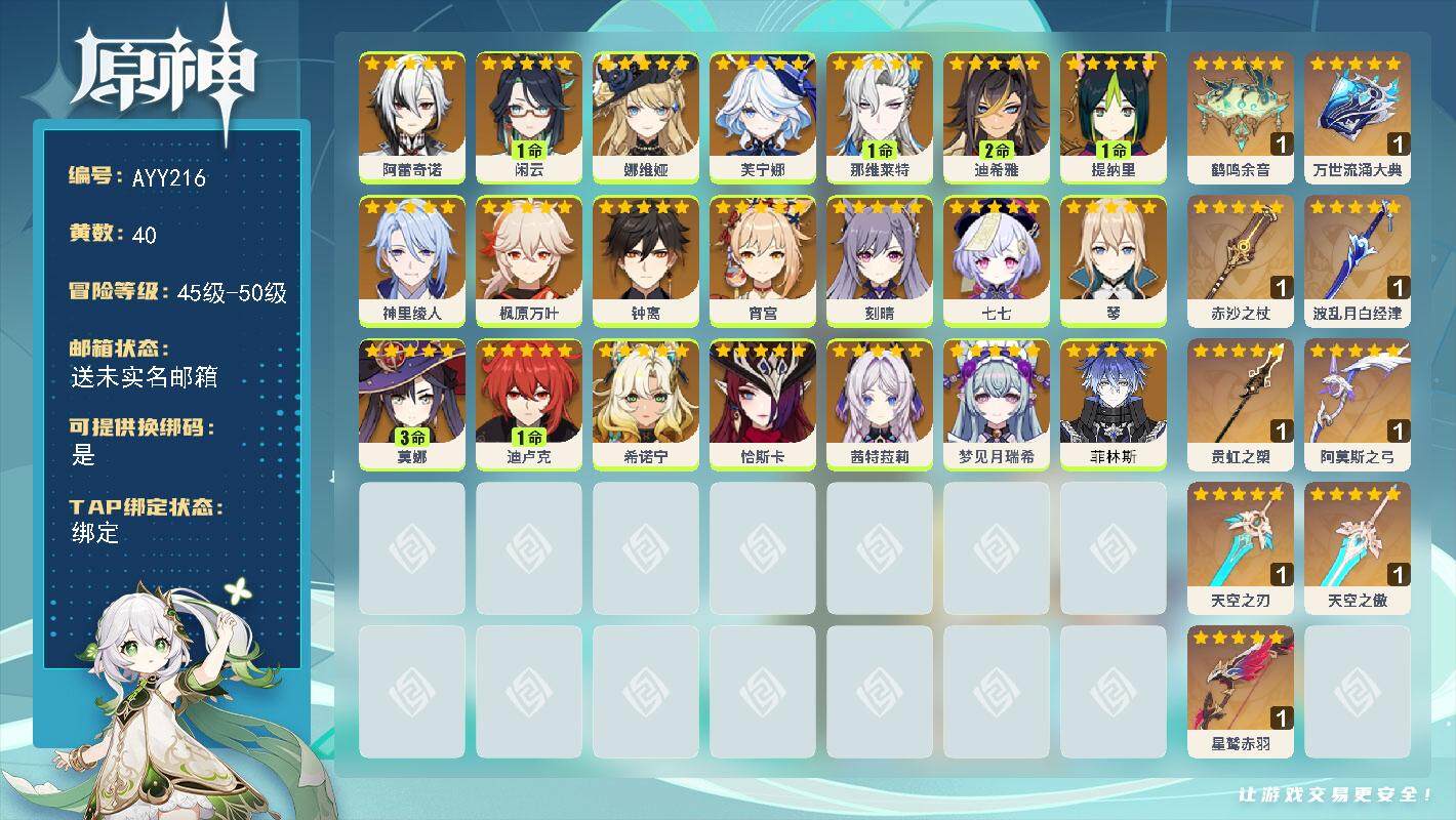 [15151000]50级/40黄/女主/21个五星角色/10个五星武器 0命阿蕾奇诺,1命闲云,0命娜维娅,0命芙宁娜,1命那维莱特,2命迪希雅,1命提纳里,0命神里绫人,0命枫原万叶,0命钟离,0命宵宫,0命刻晴,0命七七,0命琴,3命莫娜,1命迪卢克,0命希诺宁,0命恰斯卡,0命茜特菈莉,0命梦见月瑞希,0命菲林斯,精1鹤鸣余音,精1万世流涌大典,精1赤沙之杖,精1波乱月白经津,精1贯虹之槊,精1阿莫斯之弓,精1天空之刃,精1天空之傲,精1星鹫赤羽