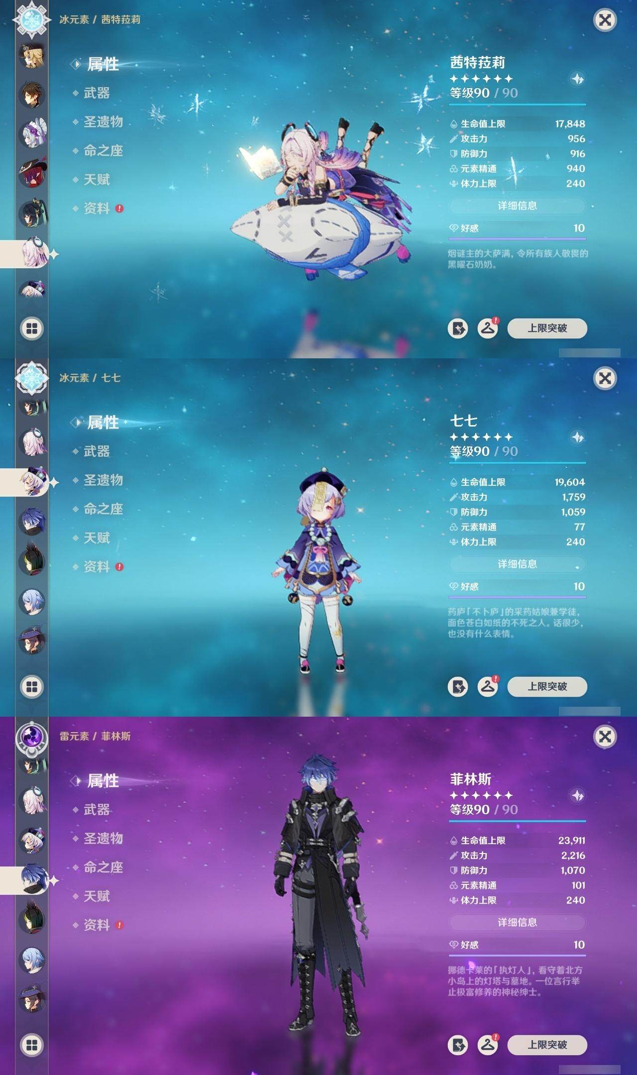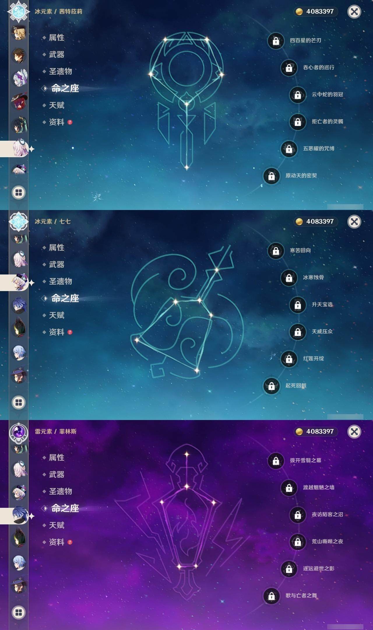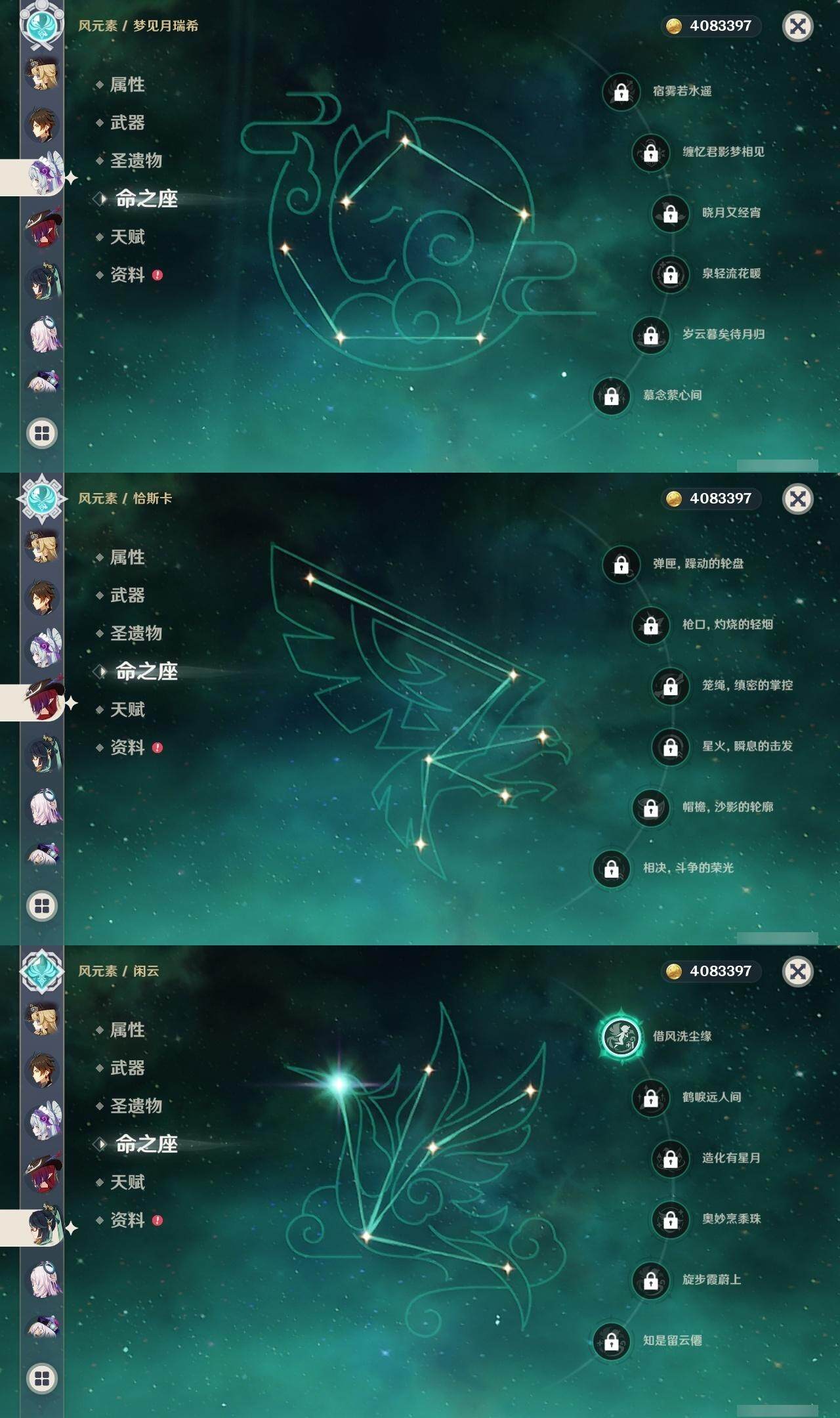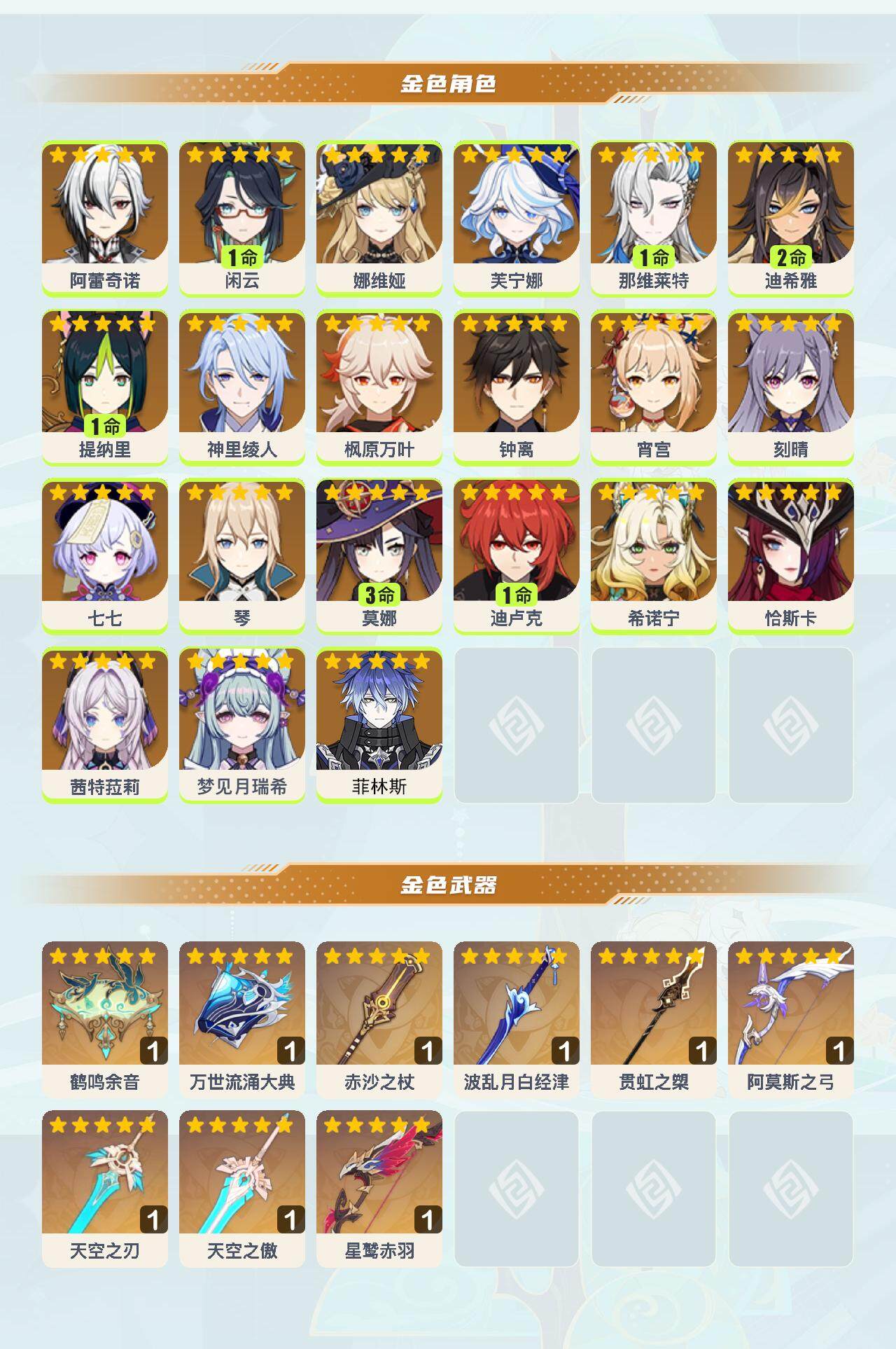 0命阿蕾奇诺,1命闲云,0命娜维娅,0命芙宁娜,1命那维莱特,2命迪希雅,1命提纳里,0命神里绫人,0命枫原万叶,0命钟离,0命宵宫,0命刻晴,0命七七,0命琴,3命莫娜,1命迪卢克,0命希诺宁,0命恰斯卡,0命茜特菈莉,0命梦见月瑞希,0命菲林斯,精1鹤鸣余音,精1万世流涌大典,精1赤沙之杖,精1波乱月白经津,精1贯虹之槊,精1阿莫斯之弓,精1天空之刃,精1天空之傲,精1星鹫赤羽