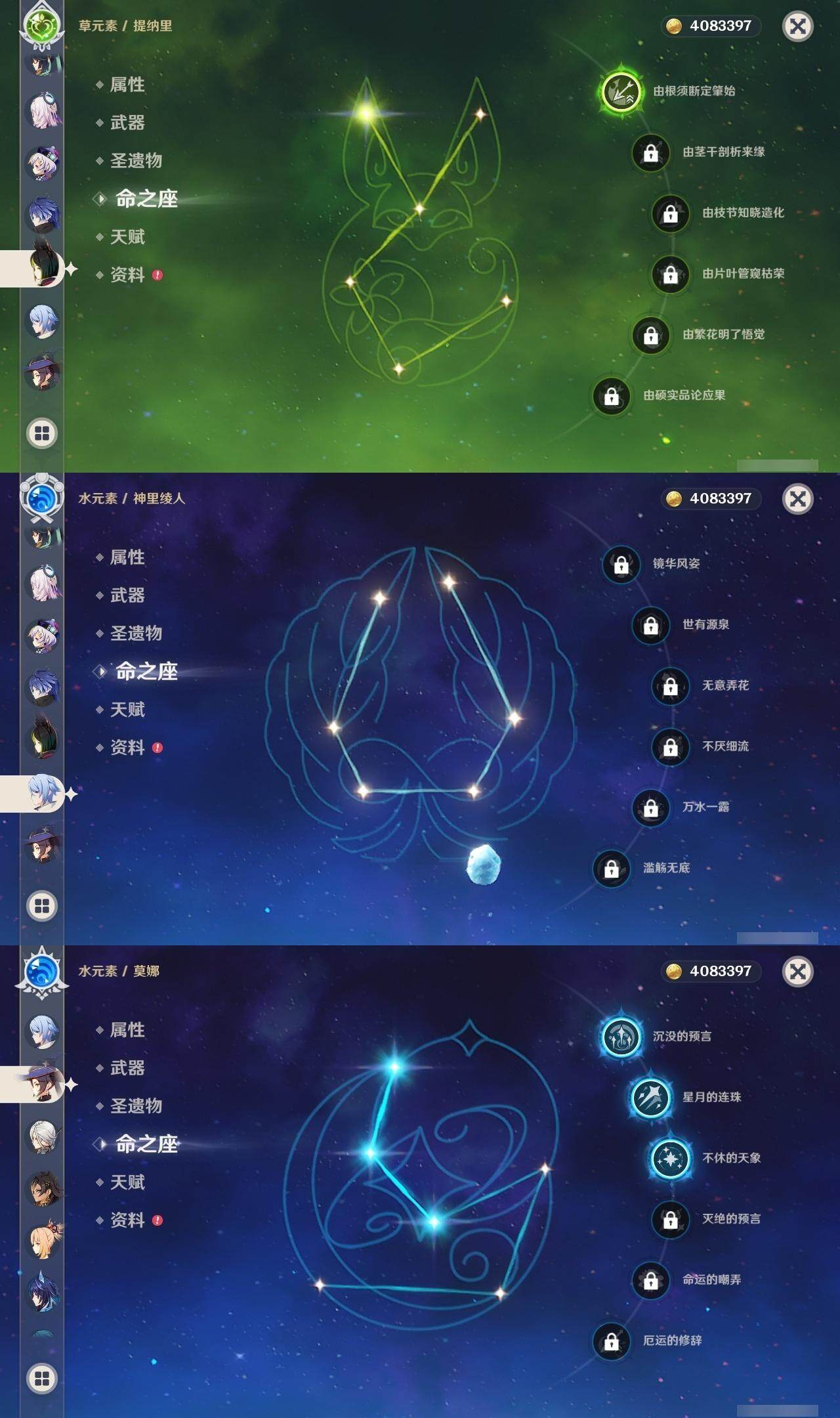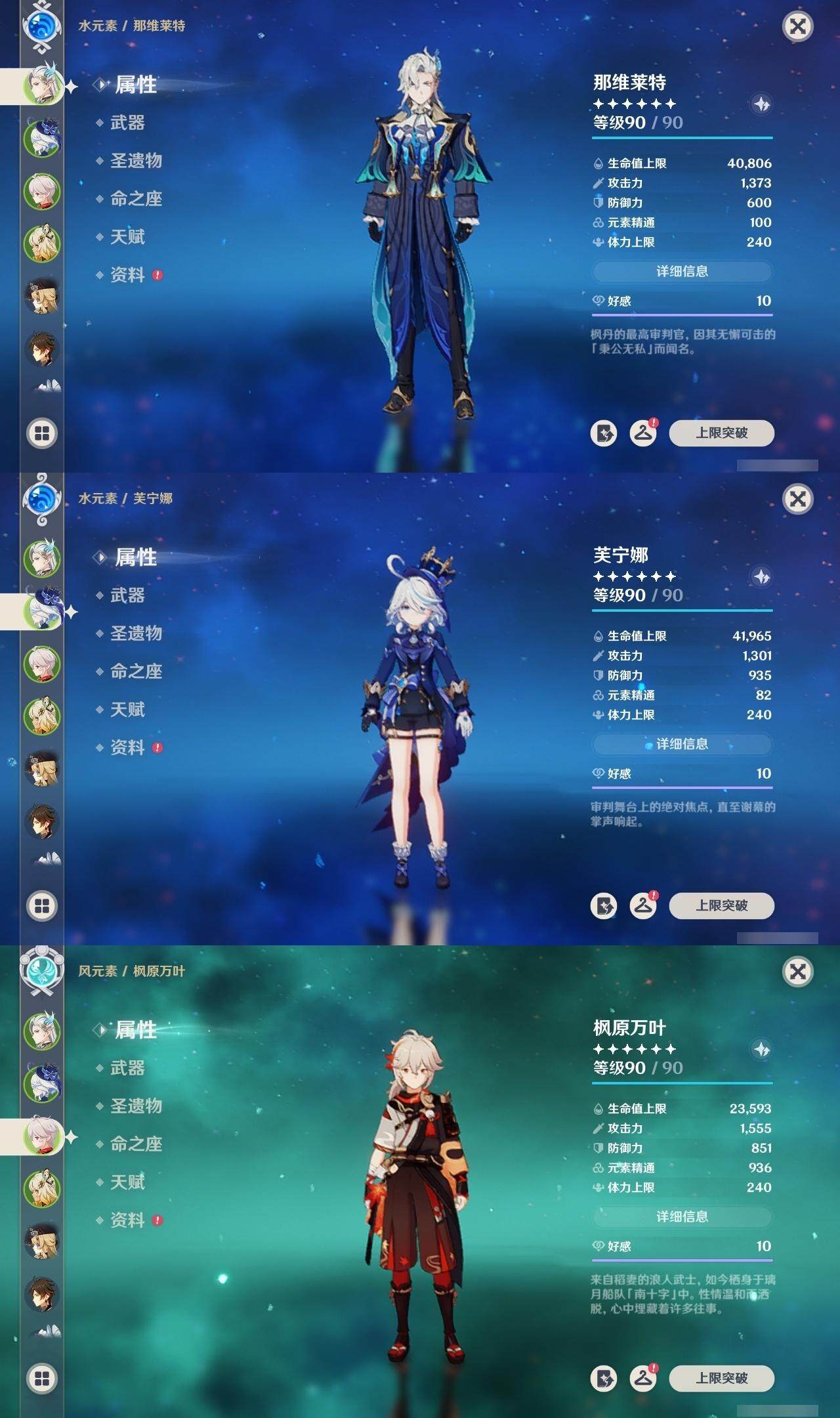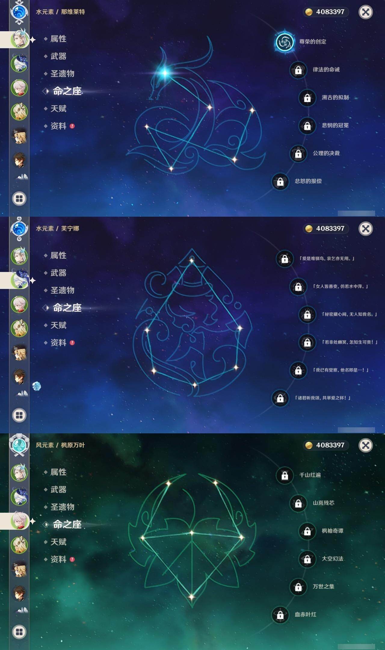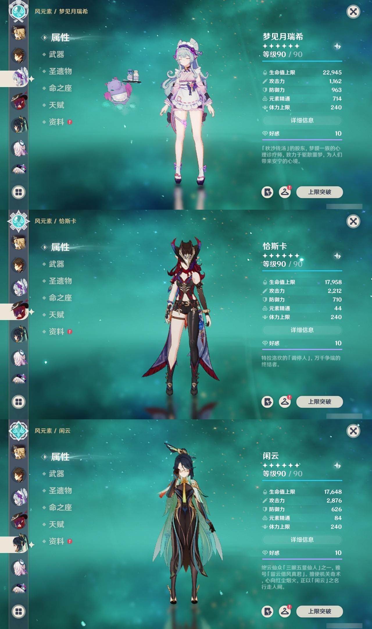 0命阿蕾奇诺,1命闲云,0命娜维娅,0命芙宁娜,1命那维莱特,2命迪希雅,1命提纳里,0命神里绫人,0命枫原万叶,0命钟离,0命宵宫,0命刻晴,0命七七,0命琴,3命莫娜,1命迪卢克,0命希诺宁,0命恰斯卡,0命茜特菈莉,0命梦见月瑞希,0命菲林斯,精1鹤鸣余音,精1万世流涌大典,精1赤沙之杖,精1波乱月白经津,精1贯虹之槊,精1阿莫斯之弓,精1天空之刃,精1天空之傲,精1星鹫赤羽