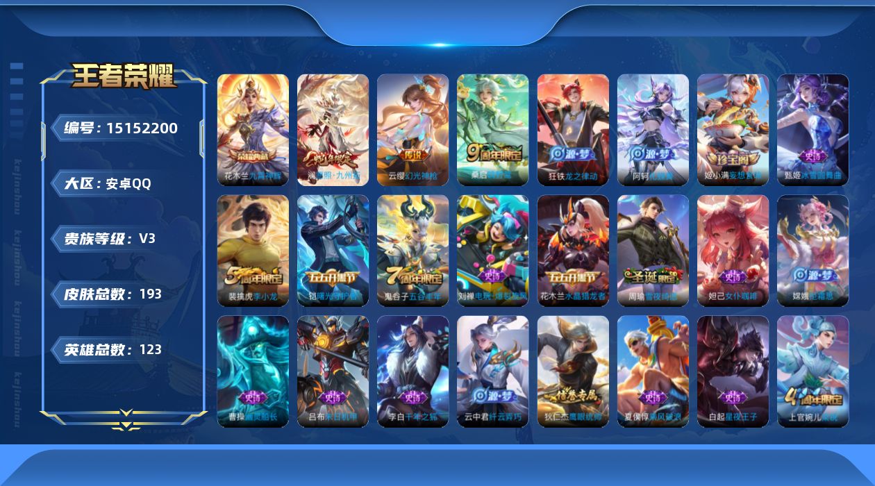 [15152200]安卓Q-V3-最强王者段位-123英雄-193皮肤-1典藏-3传说-44史诗