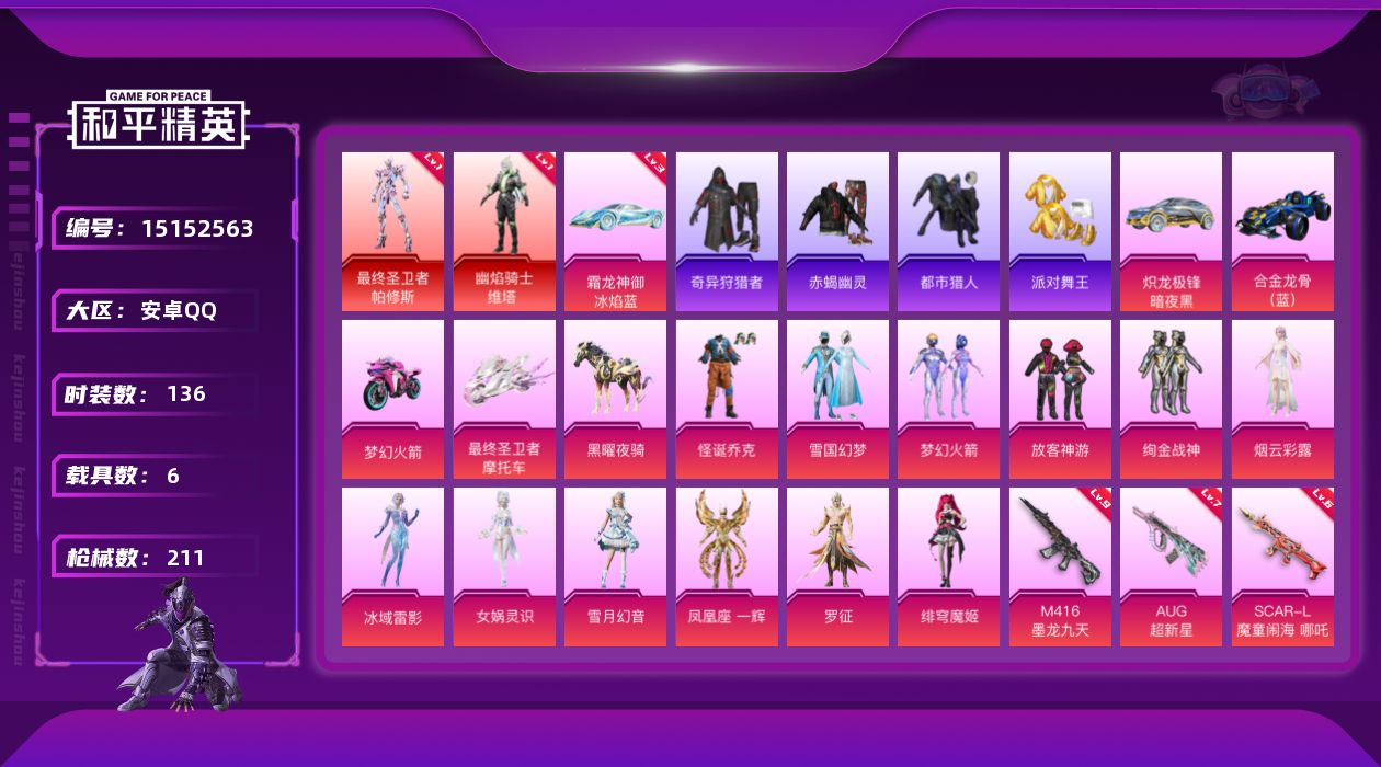 - PX_2102222- 苹果手Q-20王牌印记-有战神框-16粉装-14特效枪-4载具-热力值-214套装-320枪皮-2卓越印记-1传奇印记 【16粉装】,宝贝奶油派,放客神游,蝶舞迷情,洛天依,绯穹魔姬,智耀战神,电波星,橘柚倾心,炫光之旅,岚岚物语,海盐物语,寒光使者,仲夏莫吉托,幻影战神,未来战士,粉色回忆 【14特效枪】AKM-梦之光华-6级 SCAR-L-青春物语-4级 SCAR-L-
