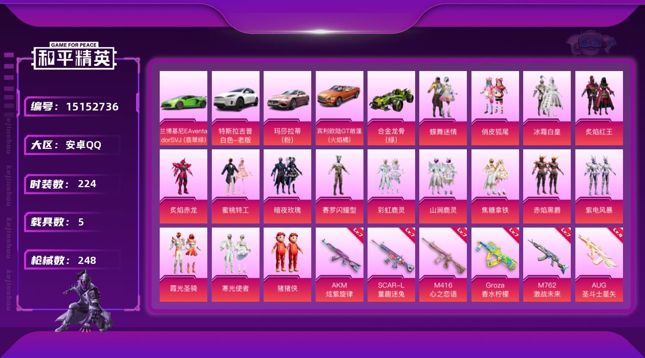 [15152736]【特价!急出!】安卓 手Q-16粉装-9特效枪-5载具-4粉色飞行器-95814热力值-15王牌印记-224套装-248枪皮 【热门品类】:套装-SS1特训,套装-粉红小猪,套装-萌熊伴侣,小恶魔头饰,熔岩游骑兵面罩,熔岩游骑兵连帽夹克 【粉色载具】:特斯拉Model X(珍珠白),兰博基尼Aventador SVJ(翡翠绿),玛莎拉蒂Ghibli(粉),宾利欧陆GT敞篷(火焰橘),合金龙骨(绿),空客H135-蔚蓝之翼 【粉色套装】:粉装-蝶舞迷情,粉装-俏皮狐尾,粉装-冰霜白皇,粉装-炙焰红王,粉装-炙焰赤龙,粉装-蜜桃特工,粉装-暗夜玫瑰,角色-赛罗闪耀型,粉装-彩虹鹿灵,粉装-山涧鹿灵,粉装-焦糖拿铁,粉装-赤焰黑爵,粉装-紫电风暴,粉装-霞光圣骑,粉装-寒光使者,玩偶服-猪猪侠 【粉色枪皮等级】:AKM-炫紫旋律(七级),SCAR-L-童趣迷兔(七级),SCAR-L-青春物语(三级),M416-心之恋语(七级),GROZA-香水柠檬(七级),AUG-圣斗士星矢(四级),M762-激战未来(七级),Kar98K-巳巳如意(四级),SVD-月影灵韵(一级) 【粉色枪皮】:AKM-炫紫旋律,SCAR-L-童趣迷兔,SCAR-L-青春物语,M416-心之恋语,GROZA-香水柠檬,AUG-圣斗士星矢,M762-激战未来,Kar98K-巳巳如意,SVD-月影灵韵 【粉色飞行器】:阿狸红飞行器,风花雪月飞行器,焦糖拿铁飞行器,星际浪客飞行器 【粉色降落伞】:银河战甲降落伞,炫紫旋律降落伞,马卡龙降落伞,诡面斩降落伞,阿狸红降落伞,童趣迷兔降落伞,香水柠檬降落伞,暗夜玫瑰降落伞,林间仙鹿降落伞,洛神天依降落伞,风花雪月降落伞,焦糖拿铁降落伞,恐龙拽拽降落伞,冷魅冰骑降落伞,炙焰牛王降落伞,圣光天使降落伞,妙趣可丽降落伞,翩跹演武降落伞,飒粉甜心降落伞,猪猪侠降落伞,幻彩电音降落伞 【稀有套装】:套装-霓虹热舞 【稀有枪皮】:AKM-夜灯,AKM-恐龙拽拽,AKM-灼热熔岩,AKM-生命誓言,AKM-萌趣颜团子,AKM-虎虎生威,AKM-霓虹街区,M16A4-幻世战舞者,M16A4-甜心亚梦,M16A4-红色方程式,SCAR-L-炫彩节奏,SCAR-L-玉兔迎春,SCAR-L-甜蜜誓约,SCAR-L-生命誓言,SCAR-L-金风玉露,SCAR-L-雷霆特警,M416-仓