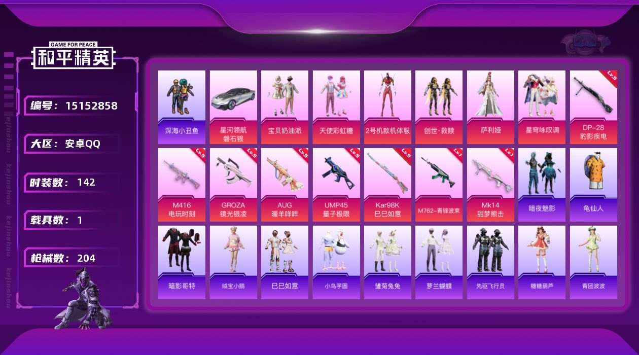 [15152858]素材身法号 安卓 手Q-6粉装-8特效枪-1载具-5.8w热力值-12王牌印记-142套装-204枪皮【热门品类】:套装-深海小丑鱼,套装-龟仙人,套装-暗影哥特【粉色载具】:星河领航(磐石银)【粉色套装】:粉装-宝贝奶油派,粉装-天使彩虹糖,角色-2号机款机体服,套装-创世·救赎,角色-萨利娅,粉装-星穹咏叹调【粉色枪皮等级】:M416-电玩时刻(五级),GROZA-镜光银凌(五级),AUG-暖羊咩咩(五级),M762-青锋波束(一级),UMP45-量子极限(五级),Kar98K-巳巳如意(五级),Mk14-甜梦熊击(一级),DP-28-豹影疾电(五级)