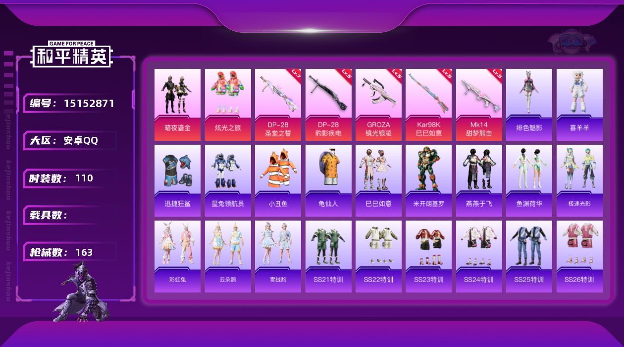 [15152871]安卓 手Q-2粉装-5特效枪-1粉色飞行器-4.4w热力值-9王牌印记-110套装-163枪皮【热门品类】:套装-小丑鱼,套装-龟仙人【粉色套装】:粉装-暗夜鎏金,粉装-炫光之旅【粉色枪皮等级】:GROZA-镜光银凌(五级),Kar98K-巳巳如意(五级),Mk14-甜梦熊击(五级),DP-28-圣堂之誓(七级),DP-28-豹影疾电(五级)【粉色飞行器】:太空嘟嘟飞行器