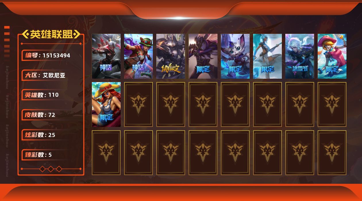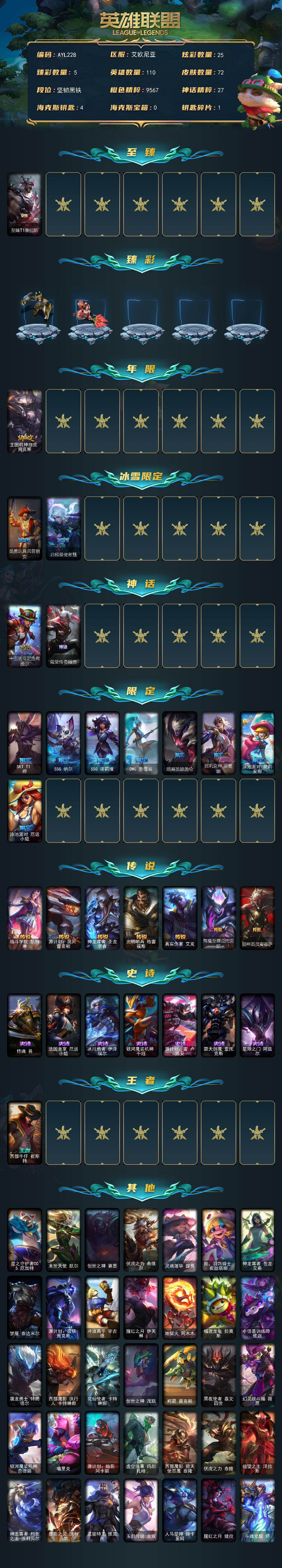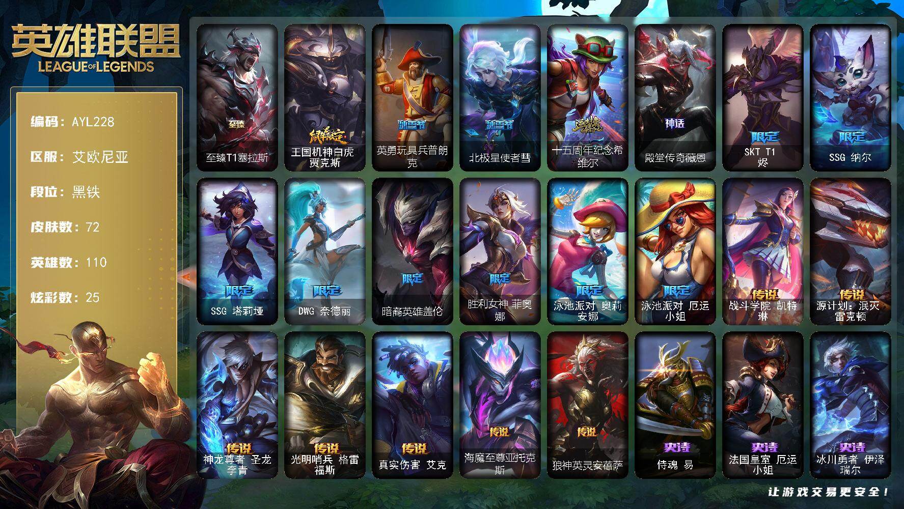 黑铁段位-110英雄-72皮肤-25炫彩-0终极-3神话-11限定-7传说-7史诗