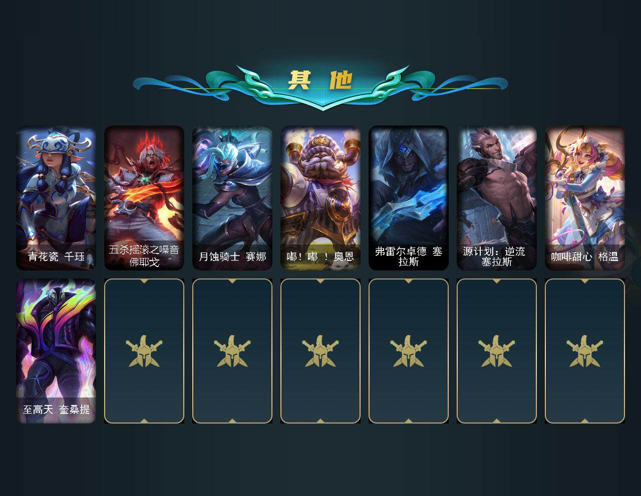 【其他皮肤1】:星之守护者COS厄加特,末世天使凯尔,创世之神赛恩,伏虎之力希维尔,灵魂莲华提莫,我羽饰骑士崔丝塔娜,神龙尊者苍龙艾希,梦魇泰达米尔,源计划孤狼贾克斯,冲浪高手辛吉德,腥红之月伊芙琳,地狱火阿木木,榴莲龙龟拉莫斯,小怪兽训练师维迦,屠龙勇士特朗德尔,西部魔影执行人卡特琳娜,花仙使者卡特琳娜,创世之神茂凯,鳄霸雷克顿,黑夜使者嘉文四世,幻灵战斗蝠薇恩,银河魔装机神奈德丽,喵里克,源计划暗影阿卡丽,虚空执事玛尔扎哈,西部魔影猎天使恶魔泰隆,伏虎之力泰隆,欲望之主泽拉斯,神龙尊者均衡之龙沃利贝尔,墨影之灵沃利贝尔,灵能特工维克托,玉剑传说无双,人马星神赫卡里姆,腥红之月婕拉,斗魂觉醒烬,青花瓷千珏,五杀摇滚之噪音佛耶戈,月蚀骑士赛娜,嘟嘟奥恩,弗雷尔卓德塞拉斯,源计划逆流塞拉斯,咖啡甜心格温,至高天奎桑提