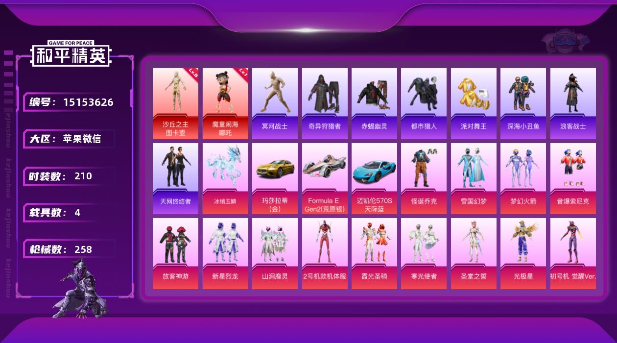 [15153626]素材身法号/沙丘之主-图卡盟(六级)/老木乃伊/地铁满天赋/M416-至情至圣(九级) 苹果 微信-2神装-18粉装-10特效枪-4载具-7粉色飞行器-10.8w热力值-15王牌印记-210套装-258枪皮 【红色神装等级】:魔童闹海-哪吒(一级),沙丘之主-图卡盟(六级)【热门品类】:粉装-怪诞乔克,粉装-雪国幻梦,粉装-梦幻火箭,粉装-音爆索尼克,套装-浪漫天命,套装-赤蝎幽灵,套装-都市猎人,套装-冥河战士,套装-派对舞王,套装-深海小丑鱼,套装-小丑鱼,套装-奇异狩猎者,套装-天网终结者,套装-暗夜行者,套装-浪客战士,角色-忠猛周仓,角色-忠真马岱,角色-忠义严颜,套装-龟仙人,套装-暗影哥特,角色-8号机,角色-Mark.06,小丑红鼻头,大砍刀-青龙偃月刀,撬棍-龙胆亮银枪,熔岩游骑兵连帽夹克【粉色载具】:玛莎拉蒂Ghibli(金),迈凯伦570S(天际蓝),Formula E Gen2(荒原银),冰绡玉鳞【粉色套装】:粉装-怪诞乔克,粉装-雪国幻梦,粉装-梦幻火箭,粉装-放客神游,粉装-新星烈龙,粉装-山涧鹿灵,角色-2号机款机体服,粉装-霞光圣骑,粉装-寒光使者,粉装-音爆索尼克,角色-圣堂之誓,角色-光极星,角色-初号机 觉醒Ver.,角色-千金淑猫,粉装-星穹咏叹调,角色-狂魅哈莉,角色-狂魇小丑,角色-罗征【粉色枪皮等级】:AKM-梦之光华(四级),SCAR-L-童趣迷兔(五级),SCAR-L-魔童闹海 哪吒(三级),M416-心之恋语(四级),M416-至情至圣(九级),P90-沙丘之主(三级),Kar98K-巳巳如意(五级),AMR-智耀战神(五级),DP-28-豹影疾电(五级),破片手榴弹-瓶中星球(七级)【粉色飞行器】:炫紫旋律飞行器,暗翼战神飞行器,齐天大圣飞行器,沙丘之主天马,繁龙极客飞行器,飞天猪飞行器