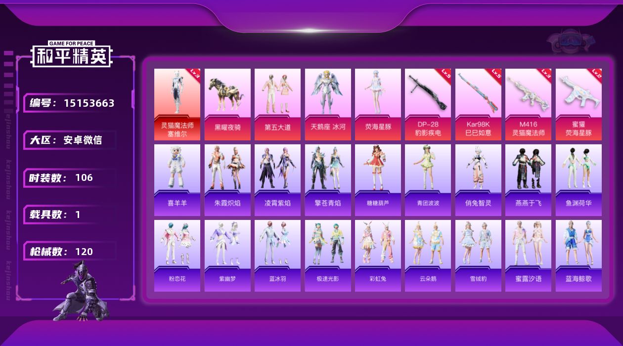 [15153663]塞维尔三级!安卓 微信-1神装-3粉装-4特效枪-1载具-1粉色飞行器-42512热力值-8王牌印记-106套装-120枪皮-可二次实名 【红色神装等级】:灵猫魔法师-塞维尔(三级) 【红色角色神装】:灵猫魔法师-塞维尔 【热门品类】:套装-SS1特训,小恶魔头饰,熔岩游骑兵面罩 【粉色载具】:黑曜夜骑 【粉色套装】:粉装-第五大道,角色-天鹅座 冰河,角色-荧海星豚 【粉色枪皮等级】:M416-灵猫魔法师(三级),蜜獾-荧海星豚(二级),Kar98K-巳巳如意(五级),DP-28-豹影疾电(五级) 【粉色枪皮】:M416-灵猫魔法师,蜜獾-荧海星豚,Kar98K-巳巳如意,DP-28-豹影疾电 【粉色飞行器】:灵猫魔法师飞行器 【粉色降落伞】:第五大道降落伞,桃粉嫣然降落伞,圣斗士星矢降落伞,荧海星豚降落伞,灵猫魔法师降落伞,绯穹魔姬降落伞,喜羊羊与灰太狼降落伞 【稀有套装】:套装-糖糖葫芦,套装-青团波波,角色-俏兔智灵,套装-燕燕于飞,套装-鱼渊荷华,套装-粉恋花,套装-紫幽梦,套装-蓝冰羽,套装-极速光影,套装-彩虹兔,套装-云朵鹅,套装-雪绒豹,套装-蜜露汐语,套装-蓝海鲸歌,套装-朱霞炽焰,套装-凌霄紫焰,套装-擎苍青焰,玩偶服-喜羊羊 【稀有枪皮】:AKM-生命誓言,AKM-虎虎生威,AKM-霓虹街区,AKM-灵猫魔法师,M16A4-夜灯,SCAR-L-炫彩节奏,SCAR-L-红色方程式,M416-夜灯,M416-红色方程式,M416-蓝色火焰,GROZA-荧海星豚,AUG-耀粉歌者,QBZ-彩虹符号,M762-牛气冲天,M762-第五大道,M762-绯红前夜,M762-云朵鹅,ARX-凌霄紫焰,UZI-众神之王,UZI-炫彩节奏,UZI-生命誓言,UZI-月影灵韵,UMP45-生命誓言,Vector-PEL轰鸣竞梦者,Vector-暗夜玫瑰,Vector-生命誓言,汤姆逊-灵猫魔法师,MP5K-众神之王,JS9-凌霄紫焰,P90-巳巳如意,Kar98K-彩虹符号,Kar98K-红色方程式,M24-众神之王,M24-幻彩电音,SKS-夜灯,Mini14-绯穹魔姬,SLR-众神之王,SVD-云朵鹅,SVD-冷漠罗丽,S686-红色方程式,S1897-荧海星豚,S12K-破晓战魂,S12K-幻世战舞者,DBS-第五大道,DBS-荧海星豚,DBS-幻彩电音