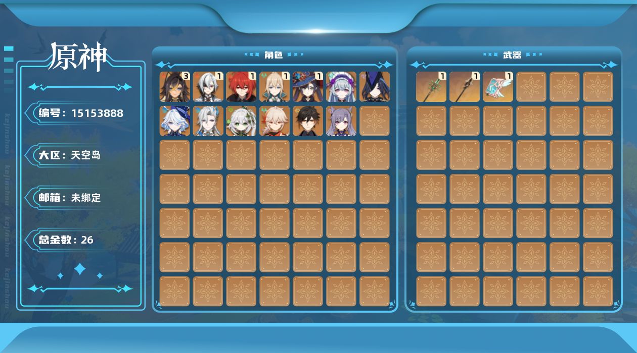 0命克洛琳德,1命阿蕾奇诺,0命芙宁娜,0命那维莱特,3命迪希雅,0命纳西妲,0命枫原万叶,0命钟离,0命刻晴,1命琴,1命莫娜,1命迪卢克,0命梦见月瑞希,1命菈乌玛,0命菲林斯,精1和璞鸢,精1贯虹之槊,精1天空之卷