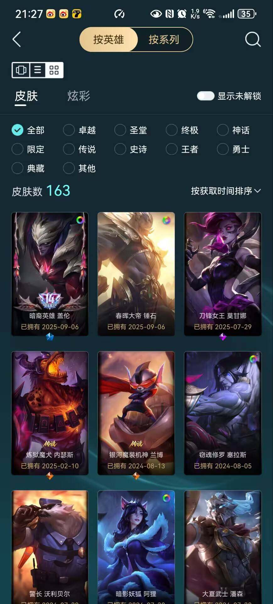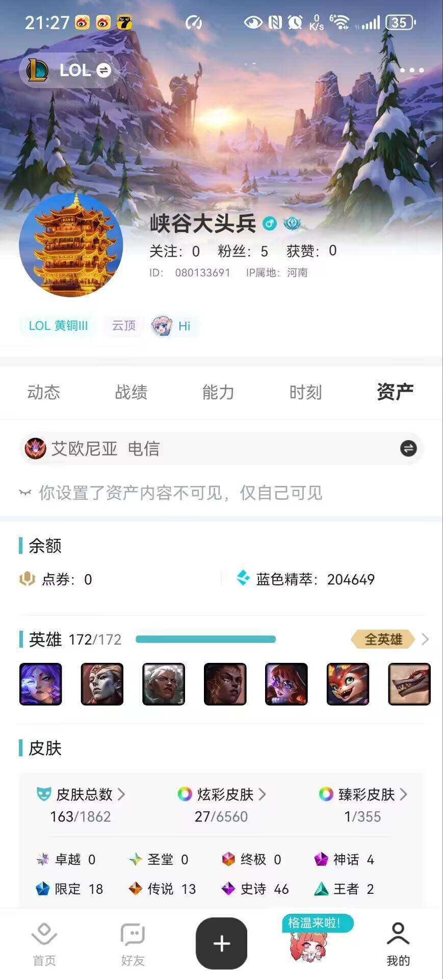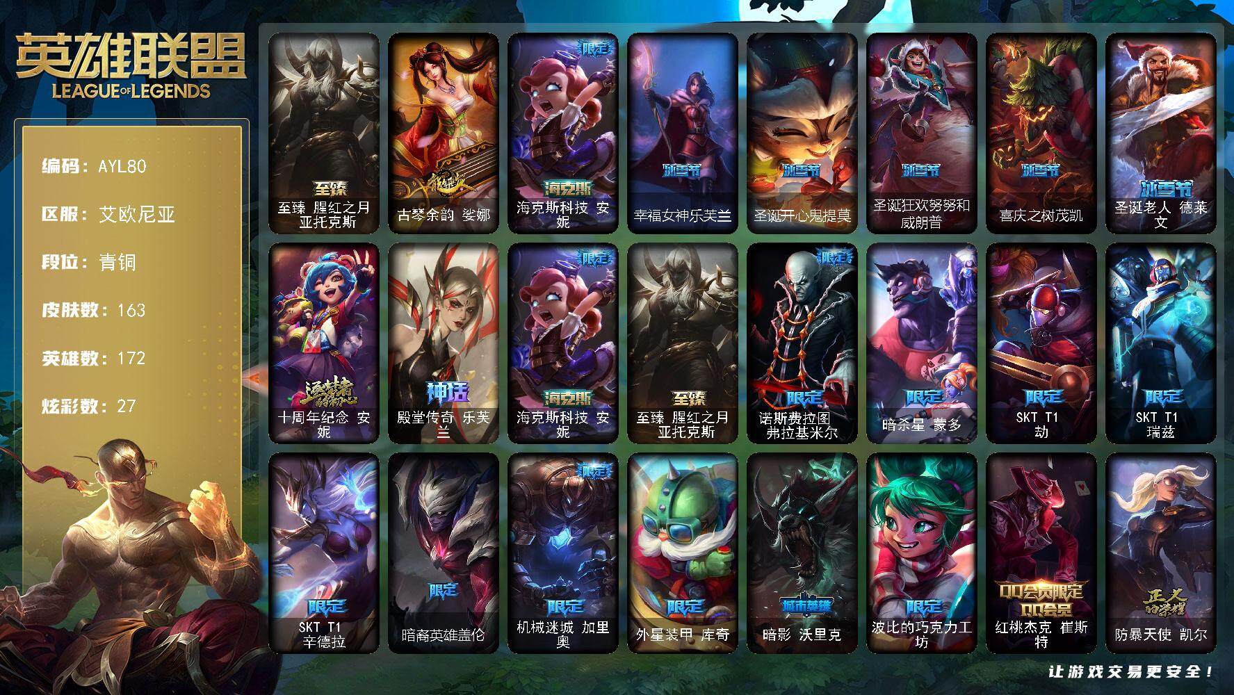 [15154332]青铜段位-172英雄-163皮肤-27炫彩-0终极-4神话-18限定-13传说-46史诗