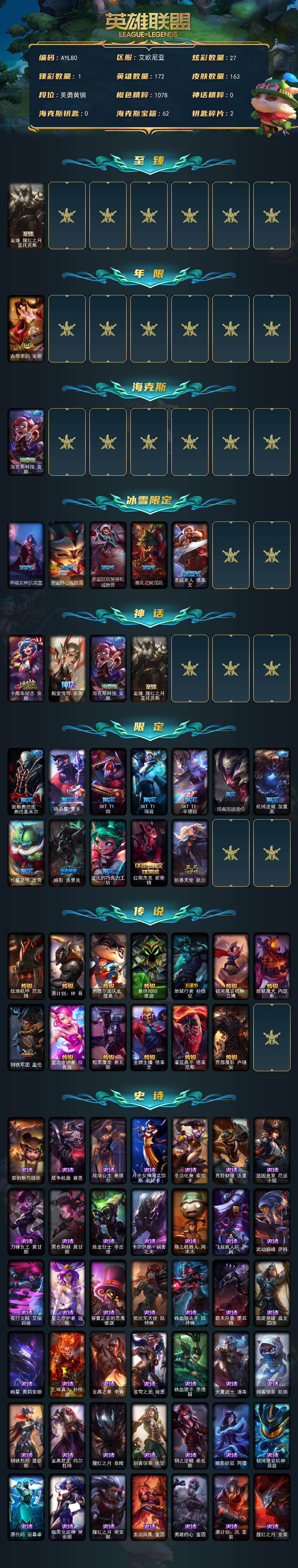 [15154332]青铜段位-172英雄-163皮肤-27炫彩-0终极-4神话-18限定-13传说-46史诗 【至臻皮肤】:至臻腥红之月亚托克斯 【臻彩皮肤】:殿堂传奇乐芙兰登神 【年限皮肤】:古琴余韵娑娜 【海克斯皮肤】:海克斯科技安妮 【冰雪限定】:幸福女神乐芙兰,圣诞开心鬼提莫,圣诞狂欢努努和威朗普,喜庆之树茂凯,圣诞老人德莱文 【神话皮肤】:十周年纪念安妮,殿堂传奇乐芙兰,海克斯科技安妮,至臻腥红之月亚托克斯 【限定皮肤】:诺斯费拉图弗拉基米尔,暗杀星蒙多,SKTT1劫,SKTT1瑞兹,SKTT1辛德拉,暗裔英雄盖伦,机械迷城加里奥,外星装甲库奇,暗影沃里克,波比的巧克力工坊,红桃杰克崔斯特,防暴天使凯尔 【传说皮肤】:战地机甲厄加特,源计划林易,约德尔国队长提莫,最终BOSS维迦,地狱行者孙悟空,银河魔装机神兰博,炼狱魔犬内瑟斯,钢铁军团盖伦,星之守护者拉克丝,黯黑魔龙希瓦娜,金牌主播德莱文,灌篮高手德莱厄斯,西部魔影卢锡安 【史诗皮肤】:安伯斯与提妮,战争机器赛恩,战场公主希维尔,月光女神阿忒弥斯索拉卡,圣洁化身索拉卡,荒野豺狼沃里克,法国皇室厄运小姐,刀锋女王莫甘娜,黑色荆棘莫甘娜,炼金狂士辛吉德,卡尔萨斯祸害之光,殇之机器人阿木木,飞越疯人院萨科,武动巅峰萨科,夜行义贼艾瑞莉娅,星之守护者迦娜,穿着正装的恶魔维迦,抵抗军天使凯特琳,铁血狙击手凯特琳,霸天巨兽墨菲特,凯旋英雄嘉文四世,暗星奥莉安娜,三昧真火孙悟空,至高之拳李青,苍穹之光薇恩,铁血猎手奈德丽,大夏武士潘森,刺客信条凯南,钢铁烈阳蕾欧娜,至高君王玛尔扎哈,腥红之月泰隆,刺客信条锐雯,钢之逆鳞希瓦娜,暗影妖狐阿狸,银河魔装机神菲兹,源代码丽桑卓,暗黑女武神黛安娜,腥红之月黛安娜,血羽凤凰奎因,勇敢的心奎因,源计划风亚索,腥红之月亚索,源计划雷卢锡安,冲击之刃劫,河水之灵娜美,糖果之王艾翁 【王者皮肤】:星空之门内瑟斯,战地之王加里奥 【勇士皮肤】:拆弹专家黑默丁格 【其他皮肤1】:幽蓝梦魇加里奥,逆转裁判崔斯特,逍遥赌侠崔斯特,潮流女王乐芙兰,社会名流乐芙兰,黑潮弗拉基米尔,幽魂费德提克,玉剑传说无极,腥红之月易,美国大叔瑞兹,原野伐木工赛恩,腥红之月希维尔,游击队员崔丝塔娜,约德尔海贼团崔丝塔娜,荒野巨兽努努和威朗普,攻城巨兽努努和威朗普,黑暗骑士艾希,魔女艾希,勇敢的心泰达米尔,腥红之月泰达米尔,黑夜使者