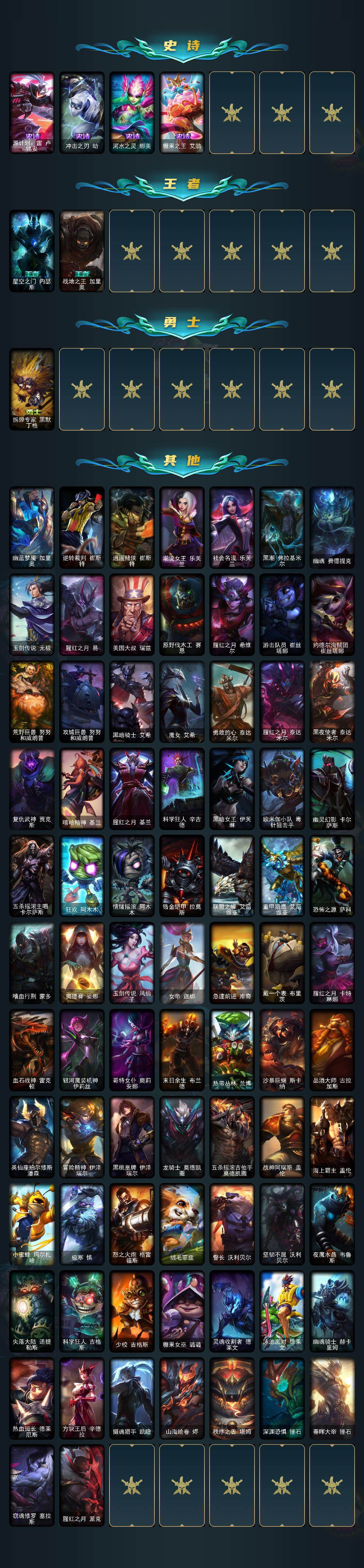 【史诗皮肤】:安伯斯与提妮,战争机器赛恩,战场公主希维尔,月光女神阿忒弥斯索拉卡,圣洁化身索拉卡,荒野豺狼沃里克,法国皇室厄运小姐,刀锋女王莫甘娜,黑色荆棘莫甘娜,炼金狂士辛吉德,卡尔萨斯祸害之光,殇之机器人阿木木,飞越疯人院萨科,武动巅峰萨科,夜行义贼艾瑞莉娅,星之守护者迦娜,穿着正装的恶魔维迦,抵抗军天使凯特琳,铁血狙击手凯特琳,霸天巨兽墨菲特,凯旋英雄嘉文四世,暗星奥莉安娜,三昧真火孙悟空,至高之拳李青,苍穹之光薇恩,铁血猎手奈德丽,大夏武士潘森,刺客信条凯南,钢铁烈阳蕾欧娜,至高君王玛尔扎哈,腥红之月泰隆,刺客信条锐雯,钢之逆鳞希瓦娜,暗影妖狐阿狸,银河魔装机神菲兹,源代码丽桑卓,暗黑女武神黛安娜,腥红之月黛安娜,血羽凤凰奎因,勇敢的心奎因,源计划风亚索,腥红之月亚索,源计划雷卢锡安,冲击之刃劫,河水之灵娜美,糖果之王艾翁