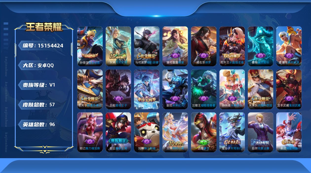 [15154424]可二次大国标猴子【店主推荐捡漏号!可直接换绑】安卓Q-V0-最强王者段位-96英雄-57皮肤-1典藏-1传说-18史诗 【荣耀典藏】:孙悟空全息碎影 【传说皮肤】:后羿神树通天 【限定皮肤】:狄仁杰阴阳师,赵云皇家上将,墨子神迹守卫,马可波罗暗影游猎,狄仁杰万华元夜,达摩星际陆战队,项羽海滩派对,老夫子航海奇遇记,程咬金演武夺筹,钟馗驱傩正仪,苏烈千军破阵,米莱狄胡桃异想国,猪八戒西部大镖客,桑启海盐诗旅,张良古海寻踪,鬼谷子天穹祈灯 【赛季限定】:狄仁杰万华元夜,程咬金演武夺筹,张良古海寻踪,钟馗驱傩正仪,苏烈千军破阵,桑启海盐诗旅,鬼谷子天穹祈灯 【战令限定】:墨子神迹守卫,马可波罗暗影游猎,达摩星际陆战队,老夫子航海奇遇记,米莱狄胡桃异想国,猪八戒西部大镖客 【史诗皮肤】:赵云皇家上将,赵云未来纪元,宫本武藏鬼剑武藏,孙尚香水果甜心,妲己魅力维加斯,刘禅绅士熊喵,曹操幽灵船长,花木兰水晶猎龙者,夏侯惇乘风破浪,兰陵王暗隐猎兽者,白起星夜王子,娜可露露晚萤,橘右京修罗,马可波罗暗影游猎,米莱狄胡桃异想国,老夫子航海奇遇记,弈星万物之道,女娲万灵启世 【其他皮肤】:项羽海滩派对,韩信教廷特使,安琪拉玩偶对对碰,亚瑟死亡骑士,达摩拳王,花木兰兔女郎,张飞五福同心,狄仁杰阴阳师,关羽龙腾万里,狂铁命运角斗场,沈梦溪鲨炮海盗猫,猪八戒西部大镖客,狄仁杰万华元夜,达摩星际陆战队,程咬金演武夺筹,张良缤纷绘卷,钟馗驱傩正仪,墨子神迹守卫,鲁班大师乓乓大师,苏烈千军破阵,桑启海盐诗旅,张良古海寻踪,后羿完美运算,鬼谷子天穹祈灯,艾琳鹤鸣心笺,项羽帝国元帅,老夫子潮流仙人,曹操超能战警,孙悟空西部大镖客,哪吒三太子,大乔伊势巫女,铠龙域领主,女娲尼罗河女神,裴擒虎街头旋风,李信灼热之刃,澜孤猎,云缨赤焰之缨 【营地ID】:1868541303 【大国标】:大国标孙悟空
