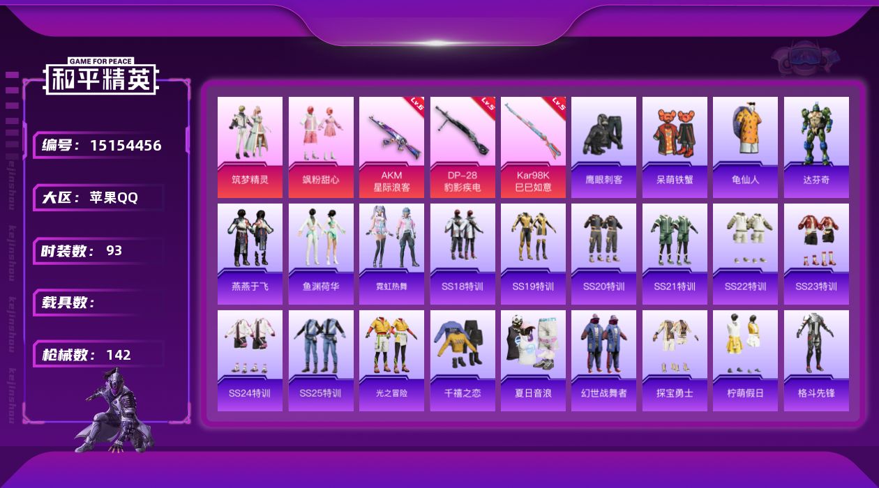 [15154456]可二次【店主推荐捡漏号!可直接换绑】 苹果 手Q-2粉装-3特效枪-4粉色飞行器-4.2w热力值-2王牌印记-93套装-142枪皮【热门品类】:套装-龟仙人【粉色套装】:粉装-筑梦精灵,粉装-飒粉甜心【粉色枪皮等级】:AKM-星际浪客(六级),Kar98K-巳巳如意(五级),DP-28-豹影疾电(五级)【粉色飞行器】:星之彼岸飞行器,青春物语飞行器,黄族统领飞行器