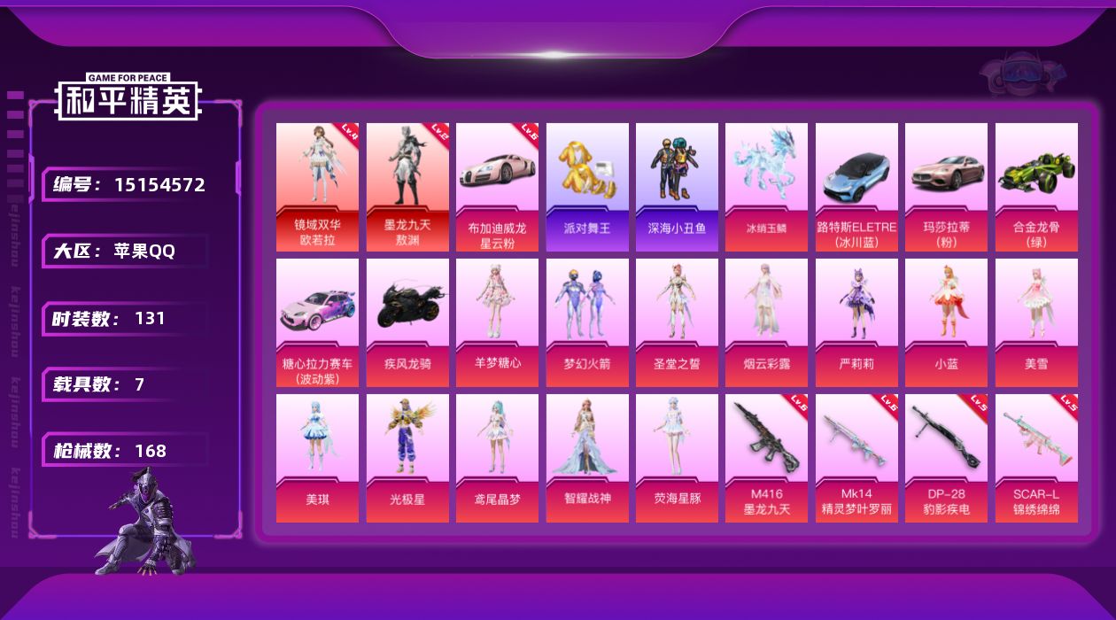 [15154572]【店主推荐捡漏号!可直接换绑】/素材身法号/布加迪威龙(星云粉)(六级)/镜域双华-欧若拉(四级)/绝世印记3 苹果 手Q-2神装-12粉装-11特效枪-7载具-7粉色飞行器-8.1热力值-8王牌印记-131套装-168枪皮【红色载具】:布加迪威龙(星云粉)(六级)【红色神装等级】:墨龙九天-敖渊(二级),镜域双华-欧若拉(四级)【热门品类】:粉装-梦幻火箭,套装-派对舞王,套装-深海小丑鱼,套装-小丑鱼,套装-龟仙人,套装-粉红小猪,套装-糯粉咩咩,角色-Mark.06【粉色载具】:路特斯ELETRE(冰川蓝),玛莎拉蒂Ghibli(粉),布加迪威龙(星云粉),合金龙骨(绿),糖心拉力赛车(波动紫),疾风龙骑,冰绡玉鳞【粉色套装】:粉装-梦幻火箭,角色-圣堂之誓,角色-烟云彩露,角色-严莉莉,角色-小蓝,角色-美雪,角色-美琪,角色-光极星,角色-鸢尾晶梦,角色-智耀战神,角色-荧海星豚,角色-羊梦糖心【粉色枪皮等级】:SCAR-L-锦绣绵绵(五级),M416-电玩时刻(五级),M416-墨龙九天(六级),GROZA-巴啦啦小魔仙(四级),M762-电糖天使(三级),P90-电糖天使(五级),Kar98K-巳巳如意(五级),M24-镜域双华(三级),Mk14-精灵梦叶罗丽(六级),DP-28-圣堂之誓(五级),DP-28-豹影疾电(五级)【粉色飞行器】:镜域双华-灵镜之阶,巴啦啦小魔仙飞行器,龙翔九天飞行器,飞天猪飞行器,灵珠游龙飞行器