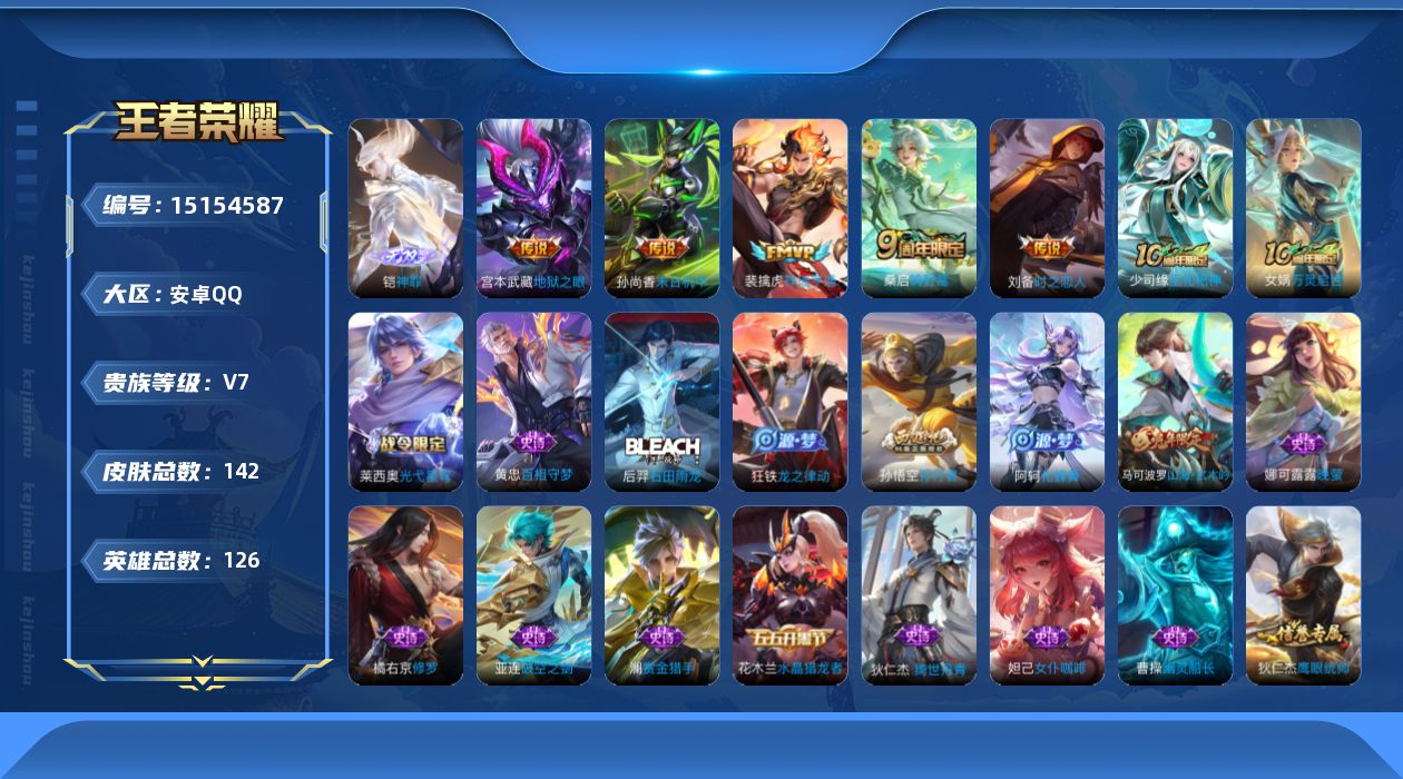 - [12321561]V8 2典藏 2珍品传说 25传说 125英雄 325皮肤 可修改实名 优质装备:鸣剑·曳影,弑枪猎影(韩信典藏),朽木白哉,黑崎一护,黄金狮子座,黄金射手座,云鹰飞将(小将军),绛天战甲(鸡嘴战神),炽阳神光,一念神魔,末日机甲-孙尚香(绿蚂蚱),地狱火,地狱之眼,末日机甲-孙策,无双飞将,燃星之曲,电玩·雷克斯,澜逐花归海,诡秘之主,千山共赴,涂山容容 传说皮:死亡执政官,九山相柳,祥瑞亨通 珍宝阁皮:优雅恋人,蔷薇恋人 限定皮:鸣野蒿,至尊宝,凤求凰(白切鸡),时雨天司(水龙头),飞衡(韩信年限),遇见飞天,诗剑行,五谷丰年,冰锋战神,游园惊梦,梁祝,祈雪灵祝(雪兔子),李小龙,逐梦之影,霸王别姬-虞姬,默契交锋-花木兰,大圣娶亲,引擎之心,冰霜恋舞曲,美猴王 史诗皮:飞车小橘子,灵蛊蚀心,龙之律动,东方月初,百相守梦-黄忠,紫霞仙子,电玩小子(小书包),白龙吟,黄金分割率,特工魅影,千年之狐,江河有灵,鹤归松栖(赵怀真),蒙恬荣光圣徽,匿光破解者,冰冠公主,偶像歌手,电玩·兔顽号,电玩·爆裂旋风,暗夜猫娘,百相守梦(关羽),龙骑士(小龙虾),末日机甲-吕布,节奏热浪,女仆咖啡,摇滚巨星,水果甜心,天才门将,星夜王子,功夫厨神,德古拉伯爵,暗隐猎兽者,幽灵船长,鬼剑武藏,地狱岩魂,繁星吟游(呼啦呼啦),缤纷独角兽,乘风破浪,逐浪之夏,水晶猎龙者,箭羽风息,金属风暴,原初追逐者,圣诞狂欢,鹰眼统帅,王者之锤,暗夜贵公子,魅力维加斯,黎明之约,赏金猎手,未来纪元-赵云,玫瑰异探