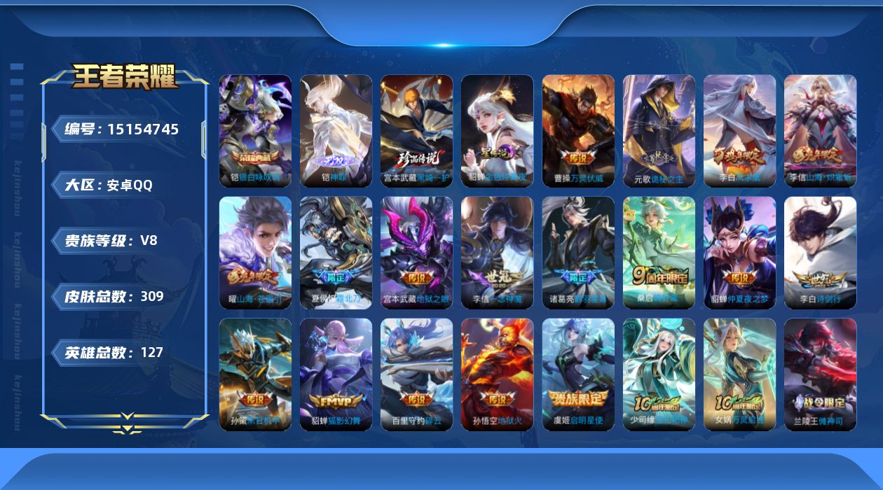 [15154745]【店主推荐捡漏号!可直接换绑】安卓Q-V8-最强王者段位-127英雄-309皮肤-1典藏-1无双-1珍品传说-19传说-77史诗 【英雄全皮】:刘禅全皮,元歌全皮,孙权全皮,狂铁全皮,李信全皮,蒙恬全皮,空空儿全皮 【荣耀典藏】:铠银白咏叹调 【无双皮肤】:铠神罪 【珍品传说】:宫本武藏黑崎一护 【传说皮肤】:杨戬纵目迁山,后羿神树通天,曹操万灵伏威,元歌诡秘之主,桑启鸣野蒿,夏侯惇霜北刀,诸葛亮鹤羽星尊,曜山海苍雷引,李信山海炽霜斩,李白诗剑行,百里守约碎云,孙策末日机甲,虞姬启明星使,李信一念神魔,貂蝉猫影幻舞,貂蝉仲夏夜之梦,李白凤求凰,宫本武藏地狱之眼,孙悟空地狱火 【限定皮肤】:白起狰,夏侯惇霜北刀,姜子牙天穹之誓,狄仁杰阴阳师,虞姬凯尔特女王,赵云皇家上将,赵云引擎之心,嬴政优雅恋人,庄周高山流水,钟无艳超时空战士,芈月白晶晶,元歌云间偶戏,元歌无心,甄姬落雪兰心,典韦穷奇,马可波罗山海玄木吟,狄仁杰魔术师,狄仁杰万华元夜,达摩沙漠行僧,项羽海滩派对,老夫子醍醐杖,程咬金演武夺筹,王昭君凤凰于飞,王昭君午后时光,兰陵王金庭之子,花木兰瑞麟志,孙悟空至尊宝,牛魔御旌,李元芳云中旅人,虞姬启明星使,干将莫邪真爱魔法,蔡文姬繁星吟游,太乙真人饕餮,鬼谷子原初探秘者,鬼谷子五谷丰年,诸葛亮鹤羽星尊,黄忠烈魂,苏烈玄武志,百里玄策原初追逐者,百里守约朱雀志,弈星混沌棋,沈梦溪大漠名商,明世隐疑决卦,裴擒虎李小龙,裴擒虎擒涛扼浪,狂铁御狮,狂铁电玩高手,米莱狄御霄,云中君纤云弄巧,李信山海炽霜斩,盾山御銮,猪八戒猪悟能,嫦娥暖冬兔眠,曜山海苍雷引,鲁班大师探海日志,桑启海盐诗旅,暃星界游侠,阿古朵江河有灵,张良古海寻踪,蒙恬荣光圣徽,姬小满妄想食味,刘邦剑破天穹,周瑜熔金海岸 【年限皮肤】:百里守约朱雀志,花木兰瑞麟志,苏烈玄武志,王昭君凤凰于飞,李白凤求凰,黄忠烈魂,马可波罗山海玄木吟,李信山海炽霜斩,曜山海苍雷引 【赛季限定】:白起狰,典韦穷奇,狄仁杰万华元夜,达摩沙漠行僧,老夫子醍醐杖,程咬金演武夺筹,兰陵王金庭之子,张良古海寻踪,牛魔御旌,李元芳云中旅人,虞姬凯尔特女王,太乙真人饕餮,鬼谷子原初探秘者,百里玄策原初追逐者,弈星混沌棋,沈梦溪大漠名商,明世隐疑决卦,裴擒虎擒涛扼浪,狂铁御狮,米莱狄御霄,盾山御銮,鲁班大师探海日志,桑启海盐诗旅,蒙恬荣光圣徽,