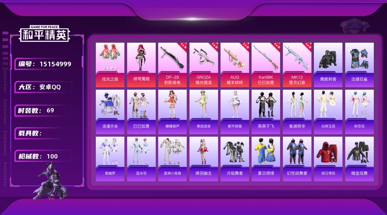 [15154999]安卓 手Q-2粉装-5特效枪-0载具-1粉色飞行器-25299热力值-2王牌印记-69套装-100枪皮 【热门品类】:套装-浪漫天命 【粉色套装】:粉装-炫光之旅,角色-绯穹魔姬 【粉色枪皮等级】:GROZA-镜光银凌(五级),AUG-暖羊咩咩(五级),Kar98K-巳巳如意(五级),MK12-雪月幻音(五级),DP-28-豹影疾电(五级) 【粉色枪皮】:GROZA-镜光银凌,AUG-暖羊咩咩,Kar98K-巳巳如意,MK12-雪月幻音,DP-28-豹影疾电 【粉色降落伞】:雪月幻音降落伞,异瞳寒姬降落伞 【稀有套装】:套装-巳巳如意,套装-雪国风尚,套装-糖糖葫芦,套装-青团波波,角色-都市丽猫,套装-燕燕于飞,套装-鱼渊荷华,套装-白辉玉蕊,套装-粉恋花,套装-紫幽梦,套装-蓝冰羽,套装-星渊小夜曲,角色-绛羽幽主,套装-炫彩糖果 【稀有枪皮】:AKM-破晓战魂,SCAR-L-夜灯,G36C-星穹咏叹调,AC-VAL-六号稻草人,UMP45-夜灯,UMP45-蓝色火焰,UMP45-极意拳锋,Vector-生命誓言,汤姆逊-炫彩节奏,AKS-74U-极光猎影,P90-巳巳如意,Kar98K-星穹咏叹调,M24-幻彩电音,M24-蓝晶绮麟,Mini14-耀粉歌者,Mk14-治愈之星,AMR-喜羊羊与灰太狼,S686-巳巳如意,S686-千金淑猫,S12K-夜灯,S12K-智耀战神,DBS-月影灵韵,M249-破晓战魂,DP-28-彩虹符号,P1911-动力核心,R1895-棋盘冕主,短管霰弹-星穹咏叹调,爆炸猎弓-喜羊羊与灰太狼,大砍刀-脆鲨七海,大砍刀-鬼刀,撬棍-冷漠罗丽,破片手榴弹-巳巳如意 【其他套装】:套装-冷焰舞者,套装-夏日倾情,套装-幻世战舞者,套装-旭日情侣,套装-暗金炫舞,套装-森林游猎者,套装-浪漫天命,套装-海岛探路者,套装-滨海厨神,套装-猎鹰,套装-猛禽,套装-王牌教练,套装-白色伏地魔,套装-破晓战魂,套装-竞技名士,套装-竞技达人朋克,套装-红色运动,套装-耀粉歌者,套装-街头潮人,套装-长空猛禽,套装-青年教官,套装-魅力单车,套装-黄色伏地魔,套装-黄色运动,套装-黑色伏地魔,套装-鹰眼刺客,套装-迅捷狂鲨,套装-冰川特警,套装-雪兔飞飞 【营地ID】:988752302