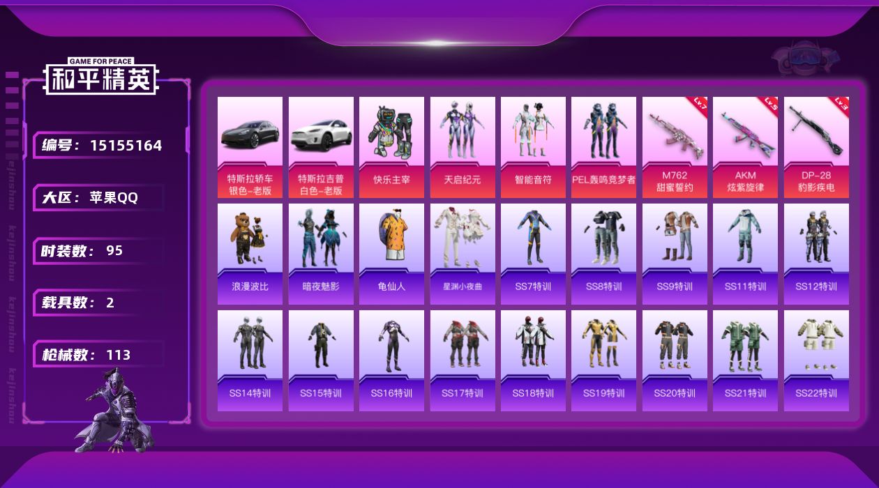 [15155164]可二次【店主推荐捡漏号!可直接换绑】 苹果 手Q-4粉装-3特效枪-2载具-1粉色飞行器-4.1w热力值-5王牌印记-95套装-113枪皮【热门品类】:套装-龟仙人,套装-浪漫波比【粉色载具】:特斯拉Model 3(冷光银),特斯拉Model X(珍珠白)【粉色套装】:粉装-快乐主宰,粉装-天启纪元,粉装-智能音符,粉装-PEL轰鸣竞梦者【粉色枪皮等级】:AKM-炫紫旋律(五级),M762-甜蜜誓约(七级),DP-28-豹影疾电(三级)【粉色飞行器】:炫紫旋律飞行器