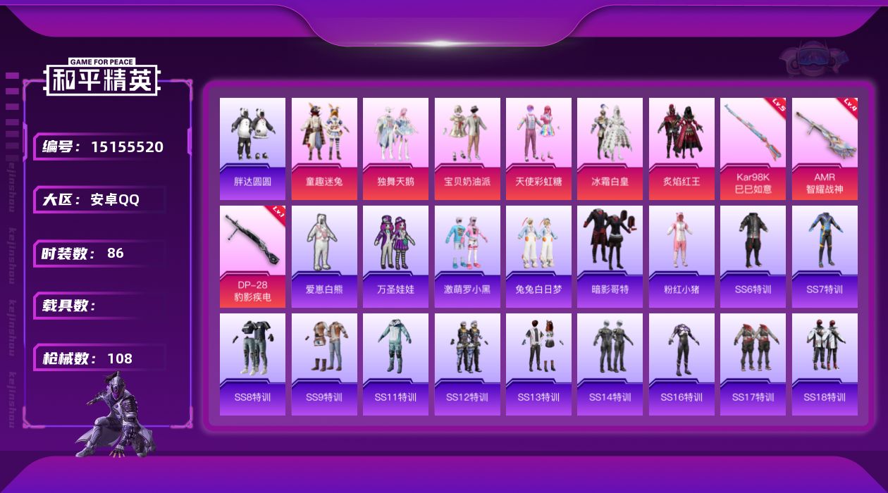 [15155520]可二次【店主推荐捡漏号!可直接换绑】 安卓 手Q-6粉装-3特效枪-1粉色飞行器-3.2w热力值-4王牌印记-86套装-108枪皮【热门品类】:粉装-童趣迷兔,套装-胖达圆圆,套装-暗影哥特,套装-粉红小猪【粉色套装】:粉装-独舞天鹅,粉装-宝贝奶油派,粉装-天使彩虹糖,粉装-冰霜白皇,粉装-童趣迷兔,粉装-炙焰红王【粉色枪皮等级】:Kar98K-巳巳如意(五级),AMR-智耀战神(四级),DP-28-豹影疾电(一级)【粉色飞行器】:星夜魔法师飞行翼