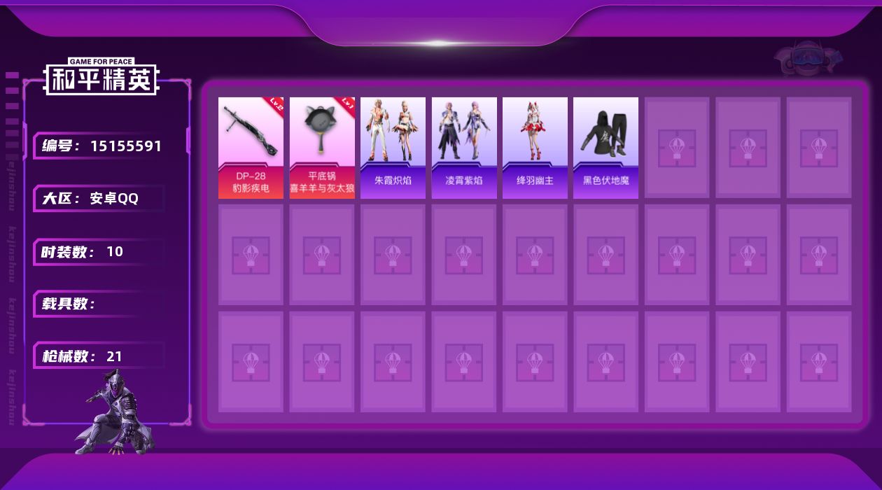 [15155591]安卓 手Q-0粉装-2特效枪-0载具-0粉色飞行器-4554热力值-1王牌印记-10套装-21枪皮 【粉色枪皮等级】:DP-28-豹影疾电(二级),平底锅-喜羊羊与灰太狼(一级) 【粉色枪皮】:DP-28-豹影疾电,平底锅-喜羊羊与灰太狼 【粉色降落伞】:绯穹魔姬降落伞,喜羊羊与灰太狼降落伞 【稀有套装】:角色-绛羽幽主,套装-朱霞炽焰,套装-凌霄紫焰 【稀有枪皮】:ARX-凌霄紫焰,UZI-啾咪啾咪,JS9-凌霄紫焰,Mini14-绯穹魔姬,MG-36-凌霄紫焰,P92-凌霄紫焰,爆炸猎弓-喜羊羊与灰太狼,平底锅-凌霄紫焰 【其他套装】:套装-黑色伏地魔 【营地ID】:1016420973