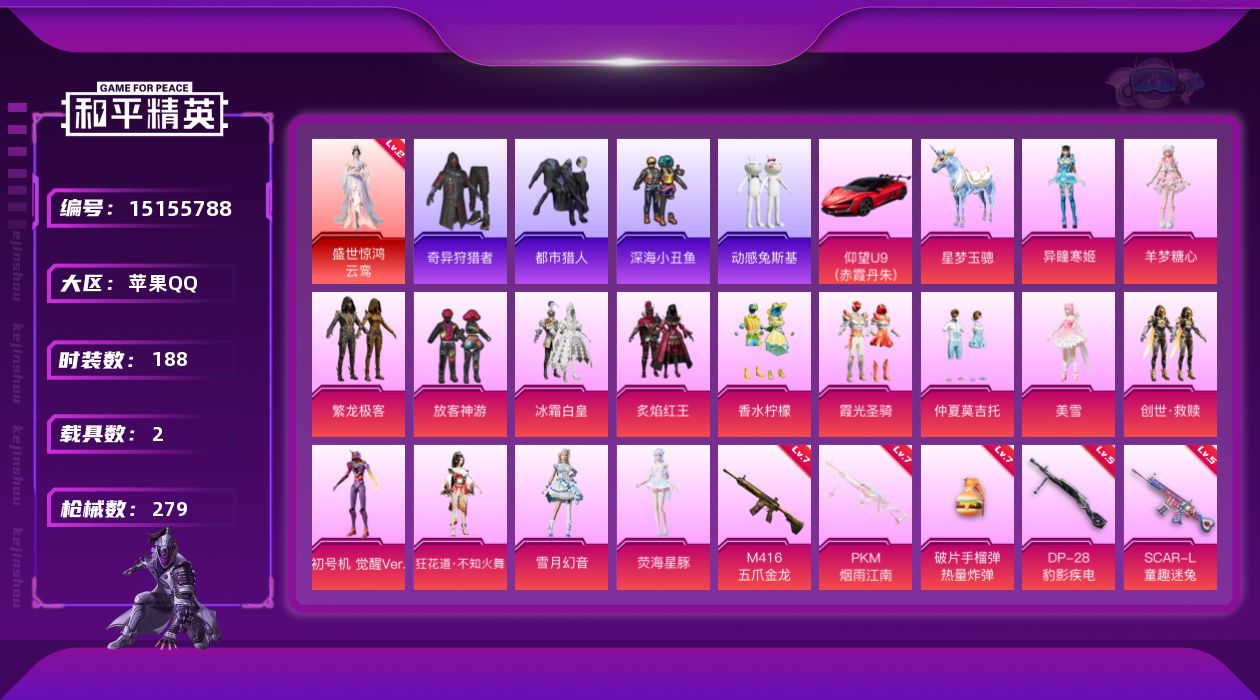 [15155788]【店主推荐捡漏号!可直接换绑】/素材身法号/无敌战神框2/绝世印记1/璀璨碎片1856/地铁满天赋 苹果 手Q-无敌战神框-1神装-15粉装-12特效枪-2载具-8粉色飞行器-9.3w热力值-15王牌印记-188套装-279枪皮【红色神装等级】:盛世惊鸿-云鸾(二级)【热门品类】:粉装-繁龙极客,套装-浪漫天命,套装-都市猎人,套装-深海小丑鱼,套装-奇异狩猎者,角色-军刀雅典娜,套装-动感兔斯基人偶服,套装-龟仙人,套装-粉红小猪,套装-红熊茄茄【粉色载具】:仰望U9(赤霞丹朱),星梦玉骢【粉色套装】:粉装-放客神游,粉装-冰霜白皇,粉装-炙焰红王,粉装-香水柠檬,粉装-霞光圣骑,粉装-仲夏莫吉托,粉装-繁龙极客,角色-美雪,套装-创世·救赎,角色-初号机 觉醒Ver.,角色-狂花道·不知火舞,粉装-雪月幻音,角色-荧海星豚,角色-羊梦糖心,角色-异瞳寒姬【粉色枪皮等级】:SCAR-L-童趣迷兔(五级),SCAR-L-锦绣绵绵(五级),M416-五爪金龙(七级),M416-灵猫魔法师(三级),AUG-超新星(五级),Vector-最终圣卫者(三级),Kar98K-创世·救赎(四级),Kar98K-巳巳如意(二级),DP-28-豹影疾电(五级),PKM-江南烟雨(七级),平底锅-喜羊羊与灰太狼(一级),破片手榴弹-热量炸弹(七级)【粉色飞行器】:镜光幻境飞行翼,镜域双华-灵镜之阶,深渊漩涡飞行器,彩虹独角兽飞行器,终晖之翼飞行器,灵猫魔法师飞行器,灵珠游龙飞行器